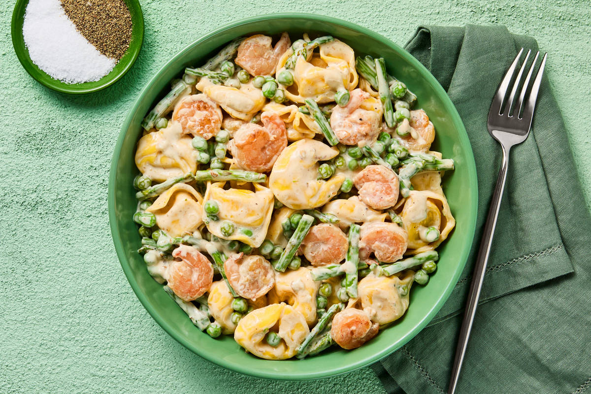 Crisp-tender asparagus and garlicky shrimp join tender, cheesy tortelloni in this quick and elevated meal that’s perfect for any day or night of the week. The shrimp simmer in a creamy, lemony sauce along with sweet green peas, while a final squeeze of fresh lemon juice over the top brightens it all up.