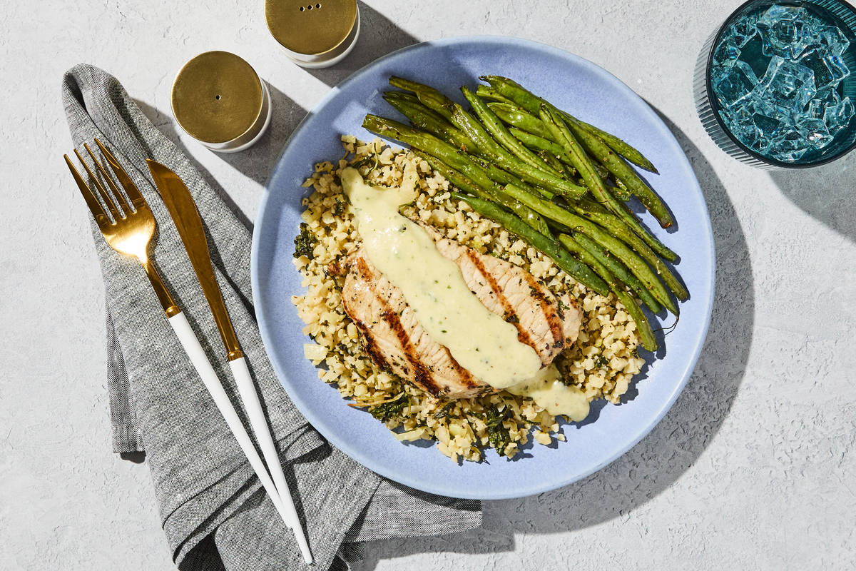 This comforting meal features a juicy grilled pork chop that's been marinated with toasted garlic, basil, and parsley. It's plated with cauliflower "rice," made with spinach, garlic, and lemon zest, for pops of brightness. Spooned over the top is a creamy pesto made extra rich with heavy cream, Parmesan, and pine nuts. On the side are roasted green beans simply tossed with olive oil, sea salt, and garlic. **Ingredients:** Pork Chop, Green Beans, Riced Cauliflower, Heavy Cream (Heavy Cream, Milk, Gellan Gum, Sunflower Lecithin), Olive Pomace Oil (Refined Olive Pomace Oil, Extra Virgin Olive Oil), Water, Onions, Whole Milk (Pasteurized Milk, Vitamin D3), Unsalted Butter (Pasteurized Cream, Natural Flavorings), Grated Parmesan Cheese (Imported Parmesan Cheese (Pasteurized Cow'S Milk, Cheese Culture, Salt, Enzymes), Water, Milk Protein, Palm Oil Blend, Disodium Phosphate, Citric Acid, Xanthan Gum, Powdered Cellulose (Anti-Caking Agent), Calcium Propionate (Preservative)), Garlic, Blanched Almond Flour, Vinegar, Pine Nuts, Basil, Sea Salt, Lemon Juice, Spinach, Parsley, Black Pepper, Apple Cider Vinegar (Diluted With Water To 5% Acidity), Spinach, Toasted Garlic Powder, Lemon Zest, Granulated Garlic, Dried Basil, White Pepper The nutrition facts are based off of the recommended serving size. Serving Size = 1 Tray (357g)