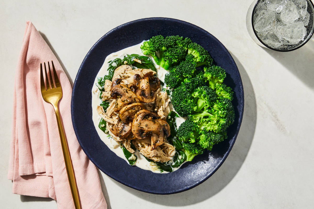 This ultra-savory dish features a flavorful sauce made with heavy cream, white wine, and herbs, adding rich creaminess to every bite. Nestled in the sauce, there are shredded chicken thighs generously seasoned with thyme, onion, and garlic plus mushrooms roasted in garlic oil. The dish is balanced with a side of broccoli enhanced with even more garlic. **Ingredients:** Boneless Skinless Chicken Thighs, Broccoli, Mushrooms, Heavy Cream (Heavy Cream, Milk, Gellan Gum, Sunflower Lecithin), Chardonnay Wine (Grapes, Sulfites), Spinach, Olive Pomace Oil (Refined Olive Pomace Oil, Extra Virgin Olive Oil), Neufchatel Cheese (Pasteurized Milk And Cream, Skim Milk, Cheese Culture, Salt, Guar Gum, Carob Bean Gum, Xanthan Gum), Onions, Water, Garlic, Grated Parmesan Cheese (Imported Parmesan Cheese (Pasteurized Cow'S Milk, Cheese Culture, Salt, Enzymes), Water, Milk Protein, Palm Oil Blend, Disodium Phosphate, Citric Acid, Xanthan Gum, Powdered Cellulose (Anti-Caking Agent), Calcium Propionate (Preservative)), Brown Chicken Stock (Chicken Stock, Mirepoix Stock (Made Of Carrot, Celery And Onion Stocks), Salt, Gelatin, White Wine), Parsley, Vinegar, Red Wine Vinegar (Diluted With Water To 5% Acidity), Sea Salt, Thyme, Toasted Garlic Powder, Granulated Garlic, Dried Parsley, Black Pepper The nutrition facts are based off of the recommended serving size. Serving Size = 1 Tray (352g)