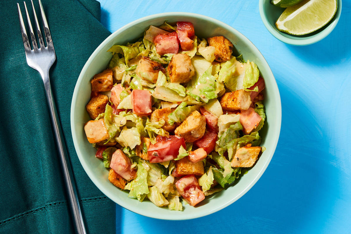 Get ready for a fresh, crunchy, and creamy 15-minute lunch salad dreamed up for all you Tex-Mex aficionados out there. This bountiful bowl features warm fajita-spiced chicken over crisp baby lettuce. It’s dressed in a creamy avocado ranch, kissed with bright, tangy lime juice, and studded with juicy diced tomato for a light, satisfying meal to fuel your afternoon adventures.