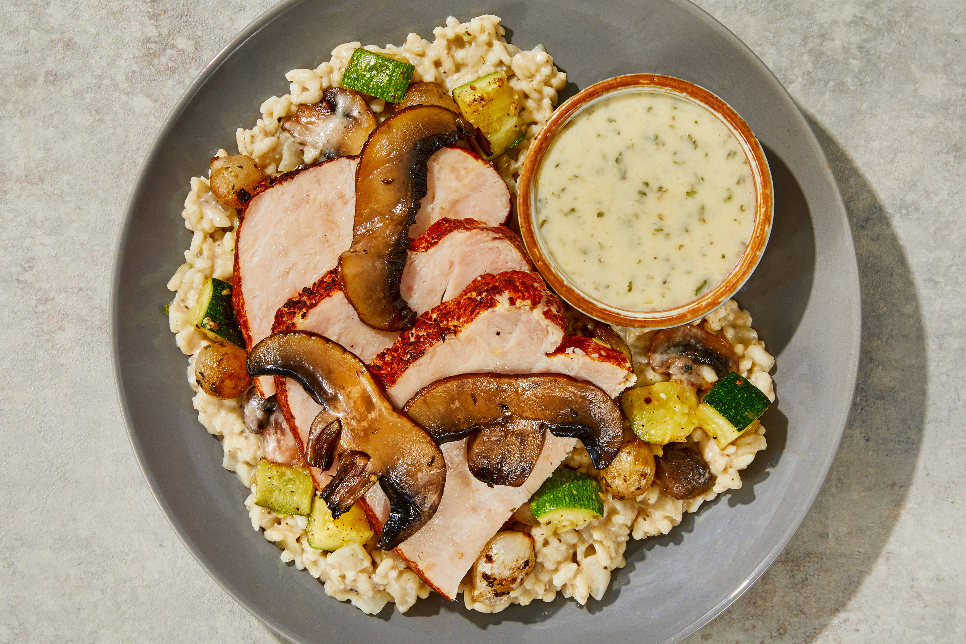 This tortelloni bakes up in a luscious, creamy basil sauce with tender mushrooms in our oven tray—which means no pots to clean! A clever bake-and-stir method delivers silky, well-coated pasta with minimal effort. A salad of crisp greens tossed in balsamic dressing and sprinkled with almonds adds welcome contrast to the rich, comforting pasta bake.
