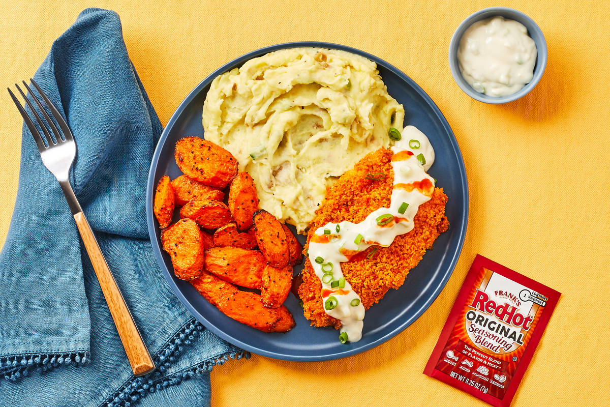 Are you the type of person who only goes to sporting events because of the possibility that Buffalo wings may be present? We’re with you, and that’s why our chefs took the beloved dish from messy app to epic weeknight dinner. First, chicken is brushed with sour cream, then coated in a Buffalo-spiced panko mixture. It’s roasted to juicy, crunchy perfection, then drizzled with creamy blue cheese sauce. Oh, and did we mention there are roasted carrots and sour cream and scallion mashed potatoes on the side?! Yeah, it’s safe to say this dish is a slam dunk.