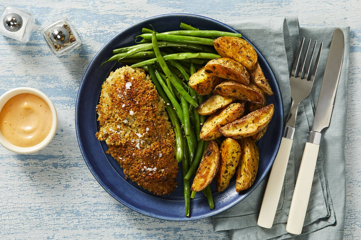 Crispy chicken is always a recipe for success. Add melty Monterey Jack and Ranch seasoning to the mix and you’ve got yourself a winning dinner. Once baked, the cheesy panko crust turns golden brown while the meat stays juicy and tender. The crunchy cutlets are served with sriracha-spiked mayo and sides of buttery green beans and crispy potato wedges. If this all sounds complicated—it’s not! 35 minutes is all you need for this delicious dish to land on your table.