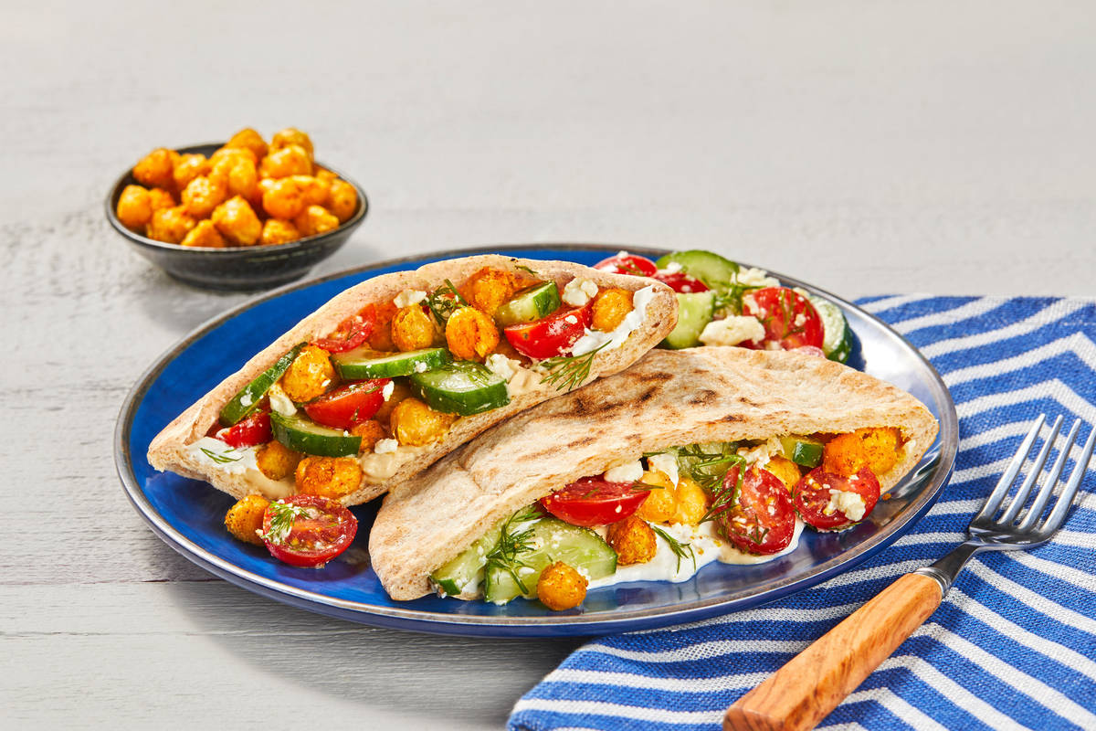 • While chickpeas cook, in a large bowl, toss together tomatoes, cucumber, dill, feta, and a drizzle of olive oil. Season with salt and pepper. • Toast pitas until warm and pliable. Halve each pita crosswise to create pockets.
