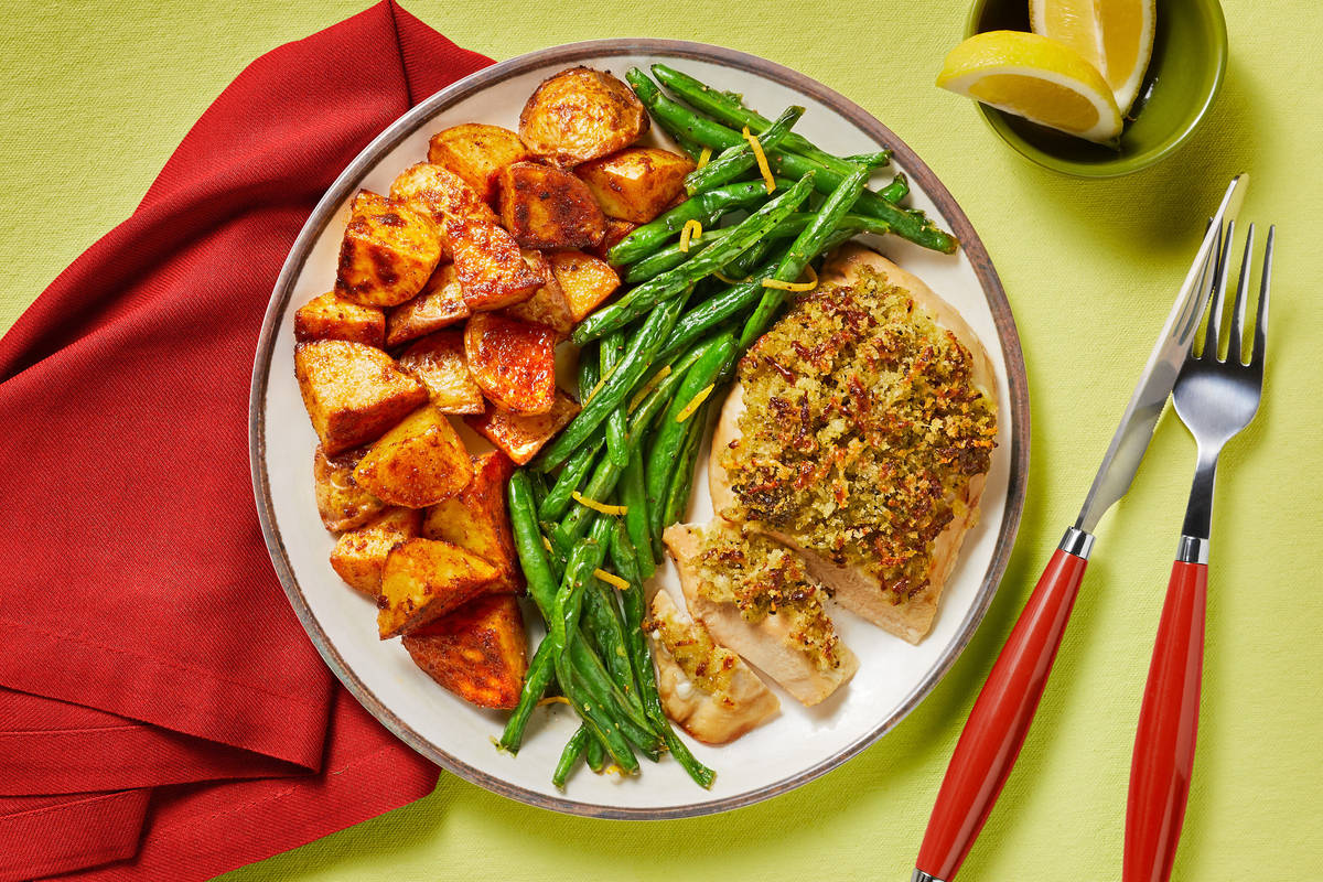 Delicious blend of flavors and easy to recreate. The chicken was moist, and I was surprised that I was very satisfied only covering the top with the panko mix instead of coating completely. The lemony green beans were crisp and zesty, and the potatoes were roasted perfectly when using the top rack as suggested.