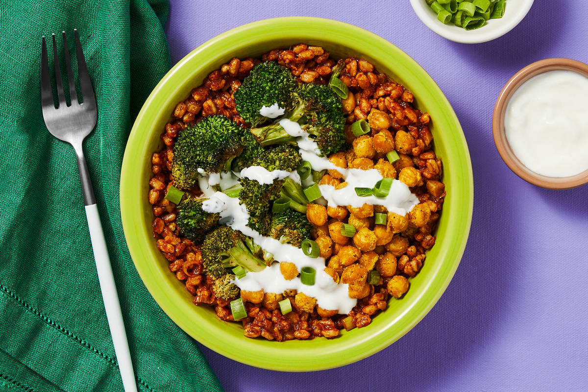 • Remove pan from heat. Stir in ½ TBSP butter (1 TBSP for 4 servings) until melted. Season with salt to taste. • Divide curried farro between bowls. Top with chickpeas and broccoli in separate sections. Drizzle bowls with yogurt. Garnish with scallion greens and serve.