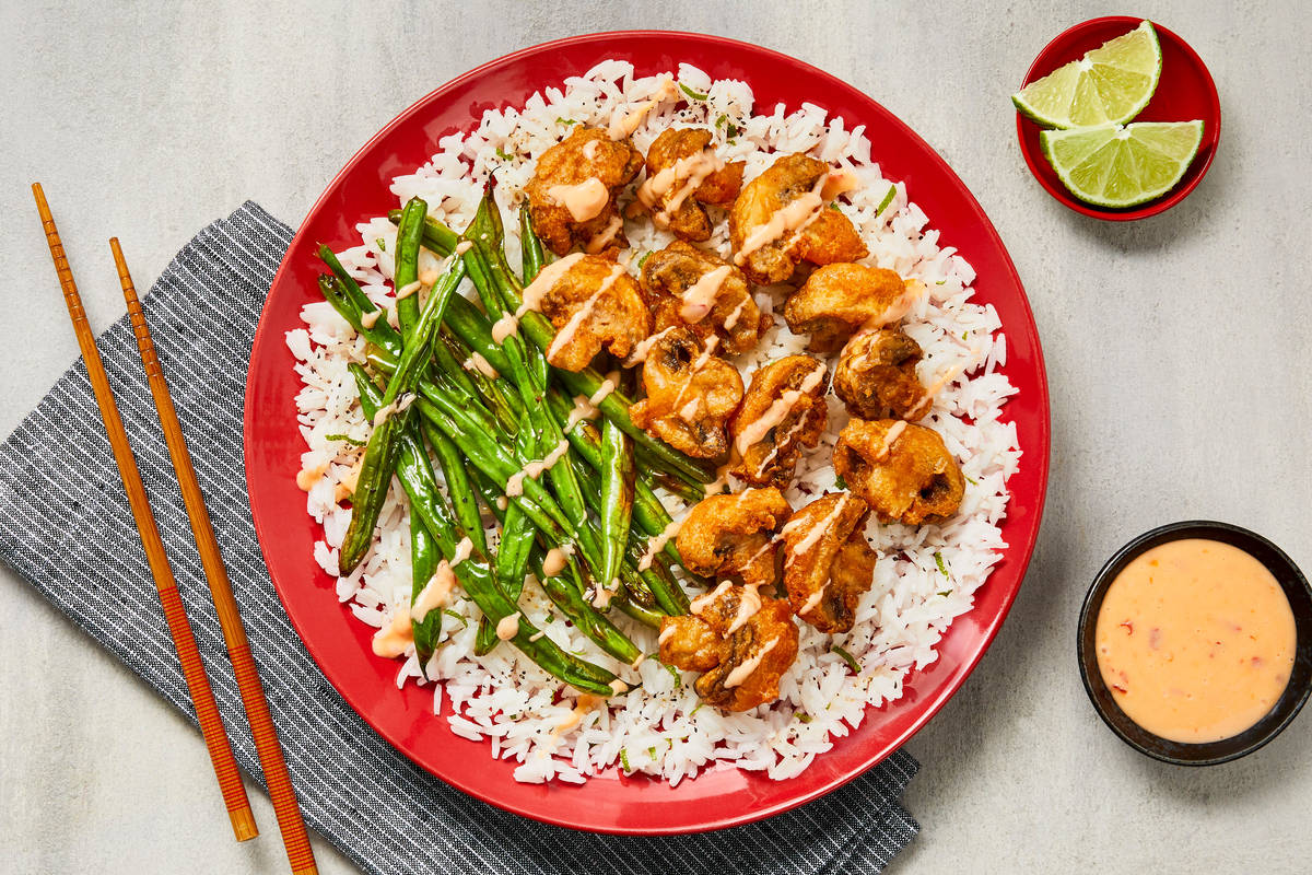 One of our favorite ways to eat our veggies? Giving them the tempura treatment! Coating them in the light, airy batter before frying yields addictively crispy, golden results you just can’t get any other way. Here, you’ll whip up tempura mushrooms, then pile them into rice bowls with tender roasted green beans. It’s all drizzled with our favorite dynamite sauce—a creamy, spicy, sweet, and savory (yes, all those things!) sauce that’s so good, you’ll find yourself swiping up every last drop.