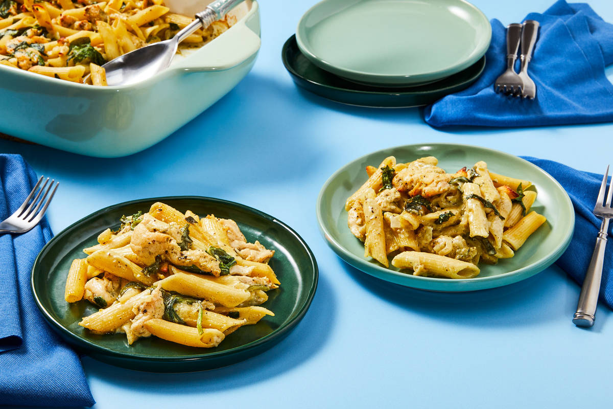 Imagine this: tender pasta with garlicky bites of juicy chicken and earthy spinach folded into a velvety lemon-Parmesan cream sauce and baked to crispy and luscious perfection. Now imagine it’s on the table, family style, ready to feed the hungriest of eaters in no time at all. The time you’ll save making this big batch meal means that much more time to hang with the fam. It’s a homey, wholesome dinner idea that’s perfect for company or just the regulars (+ leftovers—hello lunch, tomorrow!). This recipe is double the typical servings, providing 4 servings and 8 servings for a 2 person and 4 person box respectively.
