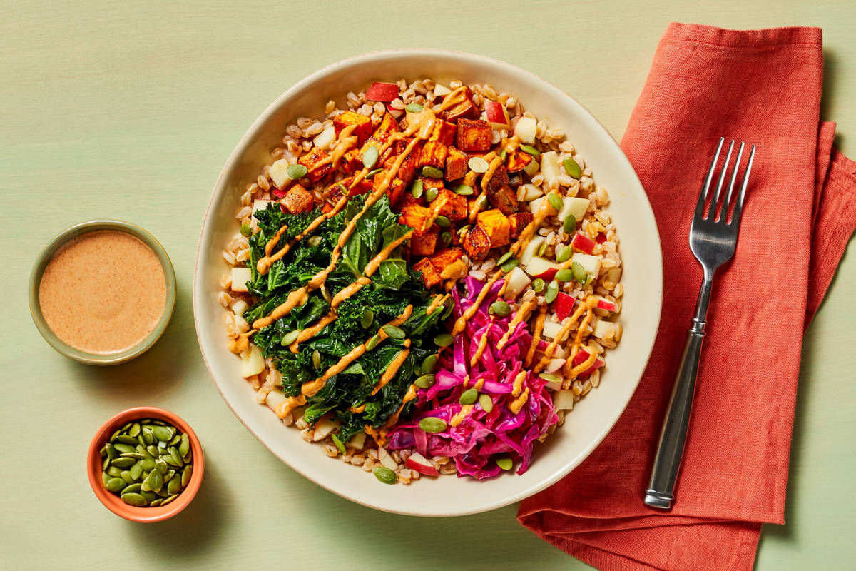 • While kale cooks, halve and core apple; cut half the apple into a small dice. • Stir 1 TBSP butter into farro until melted. Stir in diced apple and season with salt and pepper. • Divide farro between bowls and top with kale, pickled cabbage, and sweet potato. Drizzle with dressing. Sprinkle with pepitas and serve. • 4 SERVINGS: Use whole apple and 2 TBSP butter.