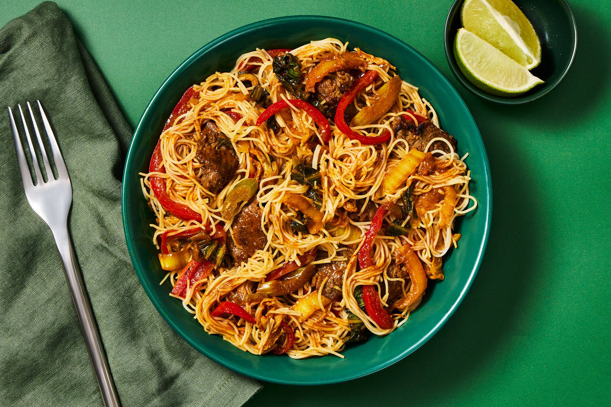 Who doesn’t love a big bowl of noodles? Inspired by Singaporean curry stir-fries, these quick-cooking rice noodles are tossed in a spicy soy-infused curry sauce and loaded up with crisp-tender veggies: bok choy, cabbage, bell pepper, and celery. You’ll toss in juicy slices of steak along with a drizzle of fiery Sriracha, plate it all up, then add a bright squeeze of fresh lime juice over the top just before serving. And boom, it’s another dreamy 15-minute dinner!