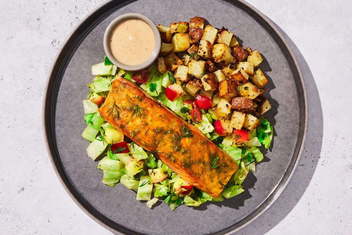 Ingredients: Atlantic Salmon (Salmon, Color Added Via Feed (Astaxanthin)), Red Potatoes (Red Potatoes, Sodium Metabisulfite (Added To Maintain Color)), Green Cabbage, Apples, Apple Cider (Apple Cider And Ascorbic Acid (Vitamin C)), Shallots, Leeks, Olive Pomace Oil (Refined Olive Pomace Oil, Extra Virgin Olive Oil), Great Northern Beans (Prepared Great Northern Beans, Water, Salt, Calcium Chloride (Firming Agent)), Chardonnay Wine (Grapes, Sulfites), Water, Apple Cider Vinegar (Diluted With Water To 5% Acidity), Garlic, Vinegar, Green Onions, Sea Salt, Thyme, Parsley, Dried Onion Flakes, Toasted Garlic, Lemon Zest, Granulated Garlic, Leek Powder, White Pepper, Toasted Onion Powder, Dried Chives, Black Pepper, Bay Leaf Powder, Dried Tarragon, Nutmeg, Baking Soda The nutrition facts are based off of the recommended serving size. Serving Size = 1 Tray (366g)