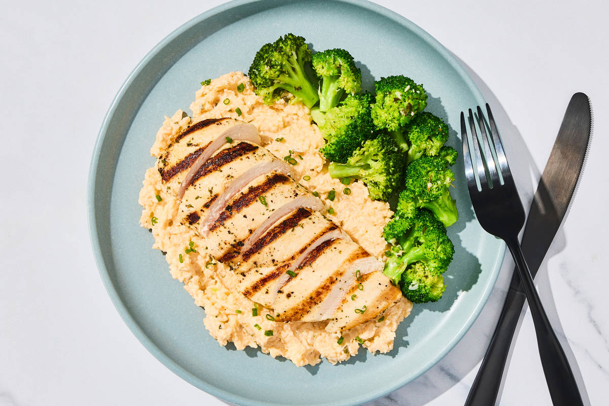 Smoky flavors run throughout this meal, starting with grilled chicken breast that's brined, then tossed with Italian herbs and roasted garlic oil. It's served over cauliflower grits that are enriched with smoked cheddar cheese. On the side is salt-and-pepper roasted broccoli topped with a smoky chili-garlic butter, which adds a punch of flavor.