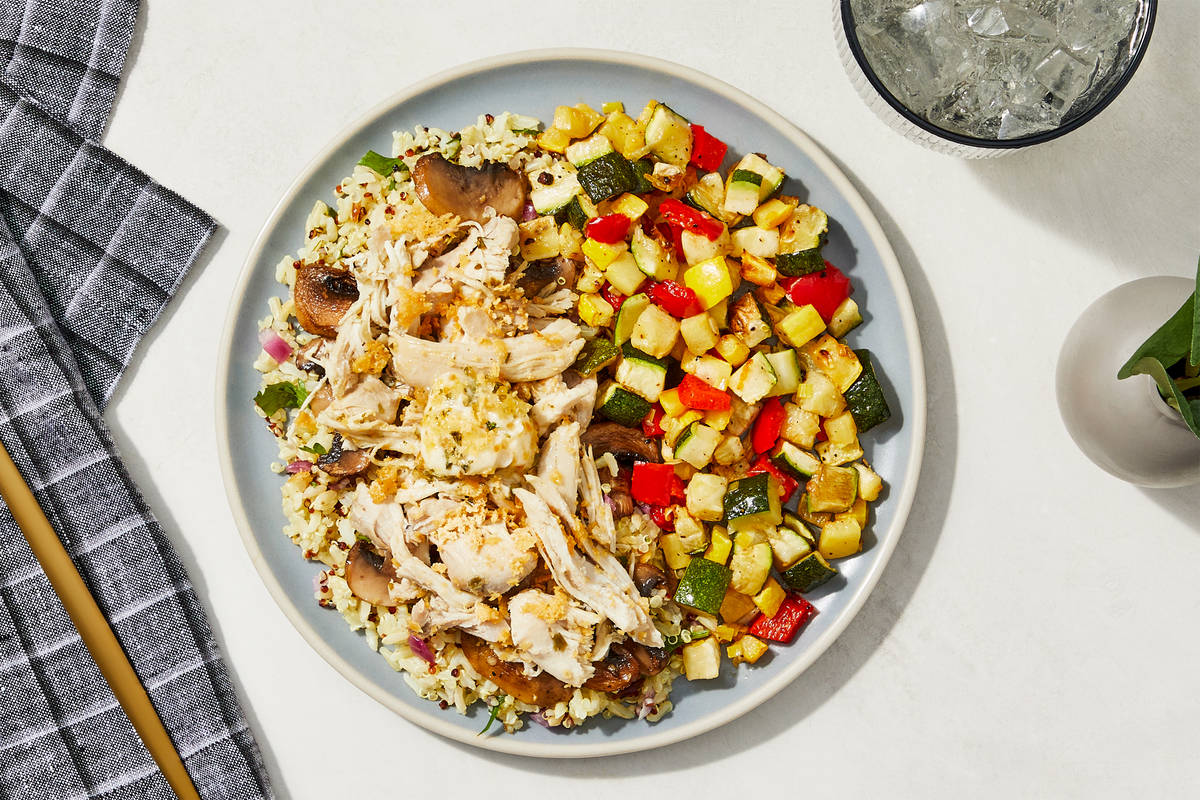 For this hearty meal, we toss shredded herbed chicken thighs in a rich, savory garlic butter, and place it atop golden-hued quinoa pilaf with garlicky roasted mushrooms and toasted Parmesan. A colorful mix of roasted zucchini, yellow squash, and red bell peppers rounds out this flavor-packed meal. **Ingredients:** Boneless Skinless Chicken Thighs, Zucchini, Water, Yellow Squash, Mushrooms, Red Bell Peppers, Tricolor Quinoa (White Quinoa, Red Quinoa, Black Quinoa), Brown Jasmine Rice, Unsalted Butter (Pasteurized Cream, Natural Flavorings), Red Onions, Grated Parmesan Cheese (Imported Parmesan Cheese (Pasteurized Cow'S Milk, Cheese Culture, Salt, Enzymes), Water, Milk Protein, Palm Oil Blend, Disodium Phosphate, Citric Acid, Xanthan Gum, Powdered Cellulose (Anti-Caking Agent), Calcium Propionate (Preservative)), Olive Pomace Oil (Refined Olive Pomace Oil, Extra Virgin Olive Oil), Garlic, Lemon Juice, Leeks, Vinegar, Mirepoix Concentrate (Vegetable Stock (Carrot, Celery And Onion Stocks), Sea Salt, Carrot Stock, Tapioca Starch, Cabbage Juice Concentrate, Celery Stock, Onion Stock, Natural Flavors, Mushroom Stock, Tomato Paste), Parsley, Sea Salt, Toasted Garlic, Toasted Onion Powder, Granulated Garlic, Black Pepper, Dried Chives, Toasted Garlic Powder, Dried Dill, Turmeric, Dried Parsley The nutrition facts are based off of the recommended serving size. Serving Size = 1 Tray (326g)