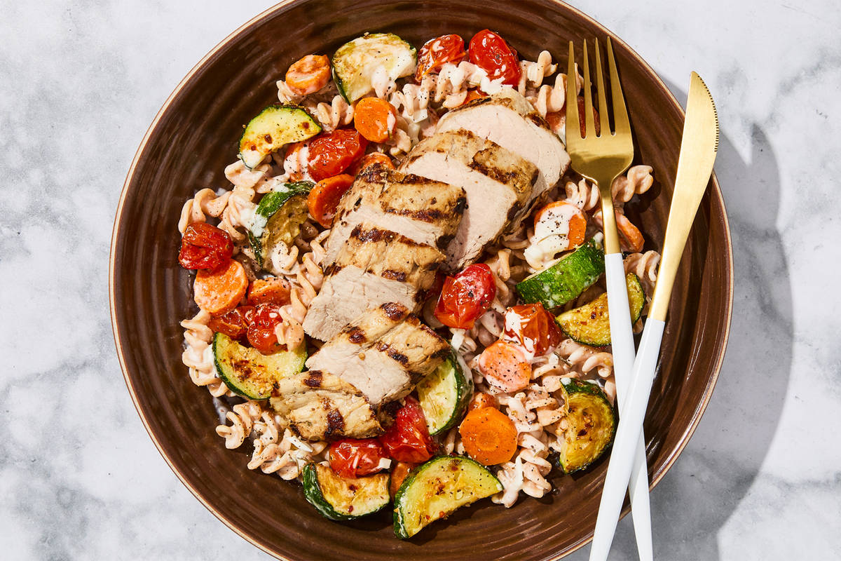**Ingredients:** Pork Tenderloin, Carrots, Zucchini, Red Lentil Fusilli (Water, Red Lentil Flour, Potato Starch, Tapioca Starch, Whole Egg, Egg White, Xanthan Gum, Salt), Grape Tomatoes, Heavy Cream (Heavy Cream, Milk, Gellan Gum, Sunflower Lecithin), Garlic, Olive Pomace Oil (Refined Olive Pomace Oil, Extra Virgin Olive Oil), Water, Onions, Chardonnay Wine (Grapes, Sulfites), Reduced Fat Milk (Pasteurized Reduced Fat Milk, Vitamin A Palmitate, Vitamin D3), Neufchatel Cheese (Pasteurized Milk And Cream, Skim Milk, Cheese Culture, Salt, Guar Gum, Carob Bean Gum, Xanthan Gum), Roasted Garlic Oil (Olive Pomace Oil (Refined Olive Pomace Oil, Extra Virgin Olive Oil) Garlic), Vinegar, Lemon Juice, Sea Salt, Toasted Garlic, Red Wine Vinegar (Diluted With Water To 5% Acidity), Rosemary, Toasted Garlic Powder, Black Pepper, Granulated Garlic, Dried Parsley, Smoked Black Pepper (Pepper, Smoke Flavor), Dried Basil, Gochugaru Chile Flakes, Dried Oregano The nutrition facts are based off of the recommended serving size. Serving Size = 1 Tray (340g)