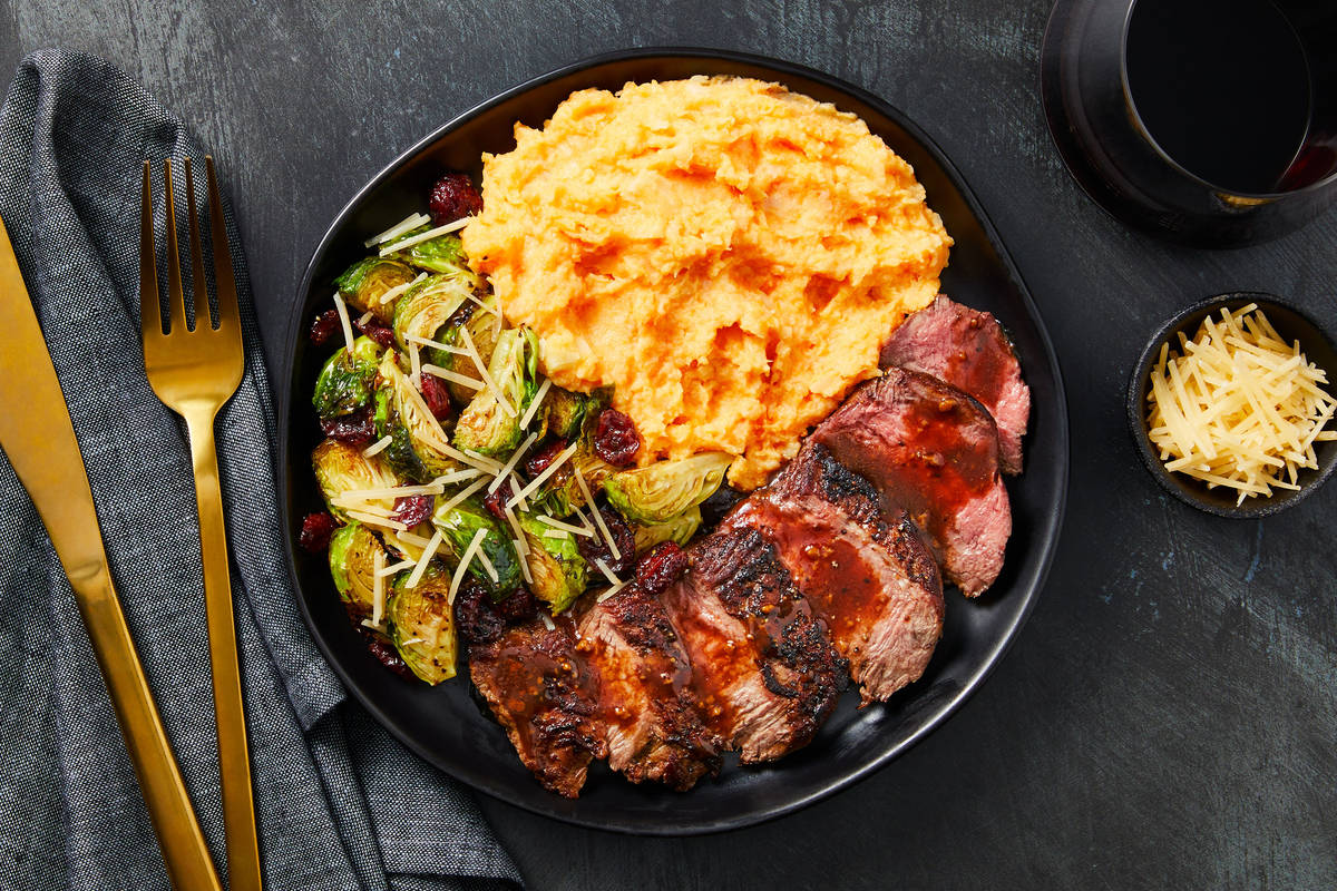As a rule, we love any meal we can brighten up with a show-stopping sauce, and this garlicky seared steak is no exception. It’s drizzled with a tangy-savory-sweet cranberry-infused garlic butter pan sauce, while the Brussels sprouts on the side get just as much love—tossed in a tangy Dijon vinaigrette and sprinkled with Parmesan. A rustic sweet potato and parsnip mash completes this trio of deliciousness that’s packed with bold flavors.