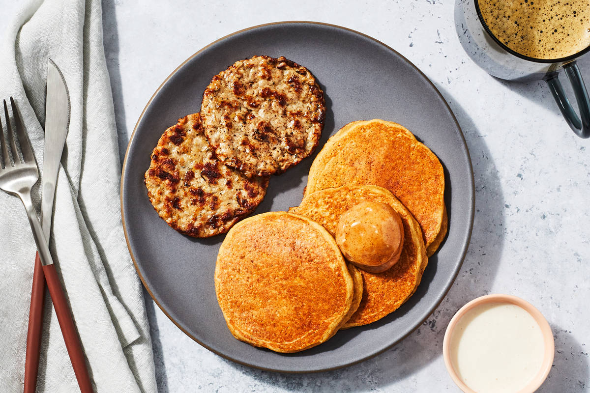 These pancakes bring the flavors of the holidays to the breakfast table, any time of the year. Made with molasses and warming baking spices (ginger, cinnamon, nutmeg, allspice and cloves), they evoke gingerbread cookies. The pancakes are served with cinnamon butter and a cream cheese drizzle, plus a side of pan-seared chicken sausage. **Ingredients:** Chicken Sausage (Chicken, Contains 2% Or Less Of: Spices, Sea Salt, Parsley, Chili Pepper Flakes, Extract Of Rosemary, Vinegar), Gluten Free Flour Blend (Sweet White Rice Flour, Whole Grain Brown Rice Flour, Potato Starch, Whole Grain Sweet White Sorghum Flour, Tapioca Flour, Xanthan Gum), Whole Milk (Pasteurized Milk, Vitamin D3), Lowfat Buttermilk (Cultured Lowfat Milk, Nonfat Milk, Sodium Citrate, Vitamin A Palmitate, Salt, Natural Flavor, Vitamin D3), Liquid Whole Eggs (Whole Eggs, Citric Acid, 0.15% Water Added As Carrier For Citric Acid. Citric Acid To Preserve Color), Cream Cheese (Pasteurized Milk And Cream, Salt, Cheese Culture, Stabilizers (Xanthan Gum, Carob Bean Gum, Guar Gum)), Blue Agave Nectar, Unsalted Butter (Pasteurized Cream, Natural Flavorings), Blanched Almond Flour, Molasses, Olive Pomace Oil (Refined Olive Pomace Oil, Extra Virgin Olive Oil), Coconut Sugar, Water, Vanilla Extract (Vanilla Bean Extractives In Water And Alcohol), Maple Syrup, Baking Powder (Sodium Acid Pyrophosphate, Sodium Bicarbonate, Corn Starch, Sodium Aluminum Sulfate, Monocalcium Phosphate, Silicon Dioxide), Vinegar, Cinnamon, Ground Ginger, Baking Soda, Nutmeg, Allspice, Cloves The nutrition facts are based off of the recommended serving size. Serving Size = 1 Tray (261g)
