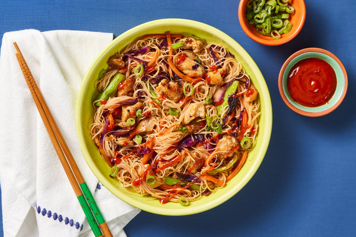 This Chinese-style ginger chicken mei fun is packed with tender rice noodles, juicy chicken thighs, and tender red cabbage and carrots. It’s all tossed with soy sauce, umami-ginger sauce, and as much spicy-sweet Sriracha as you like—a harmonious blend sure to entice everyone to the table. Sprinkle your bowls with a shower of zingy fresh scallion greens, then whisk it to the table in a quick 15 minutes!