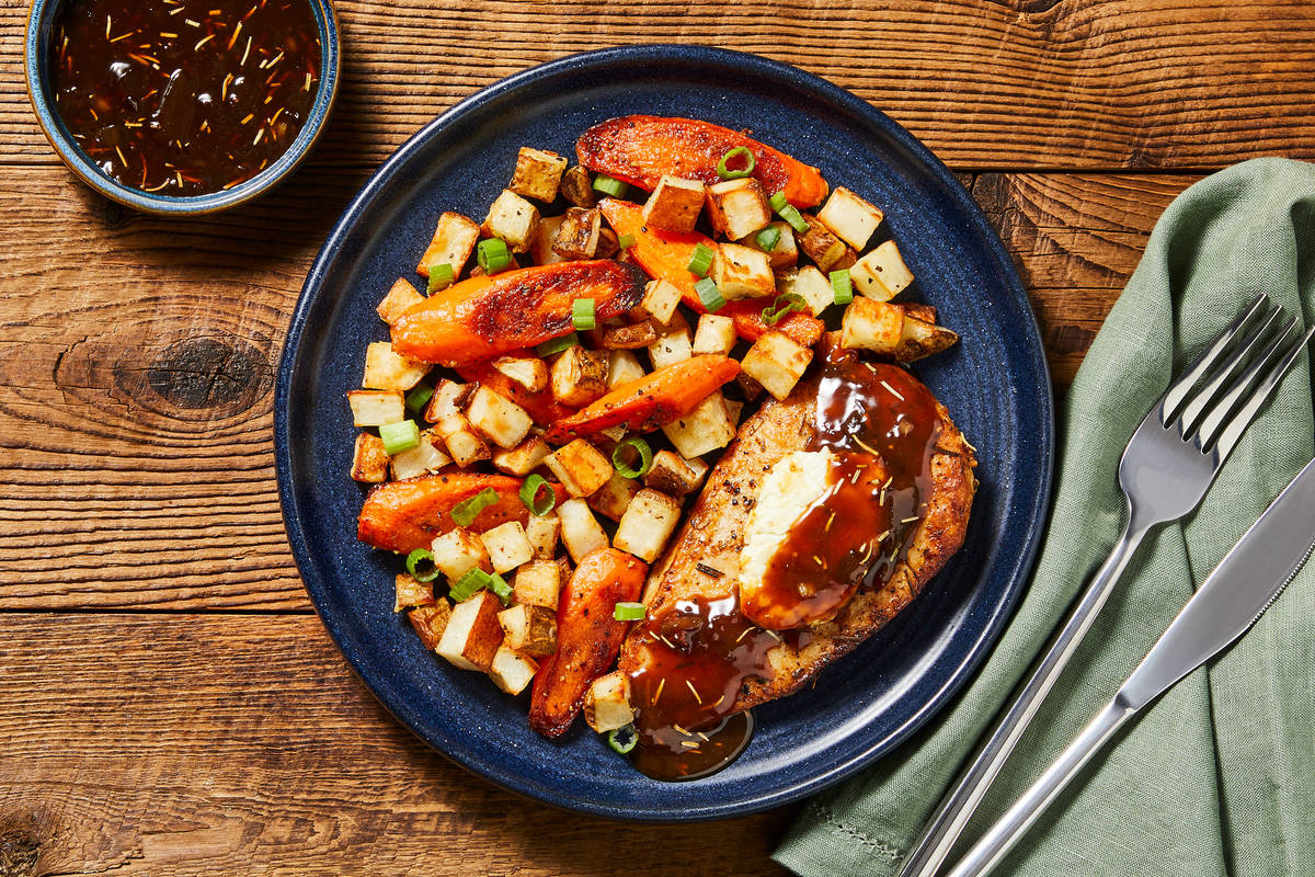 This worked out very well. Love the fig jam and vinegar together, plus the goat cheese. Perfect together. I would have liked a small onion or shallot to roast with the potatoes and carrots, and I added minced garlic to the pan sauce.