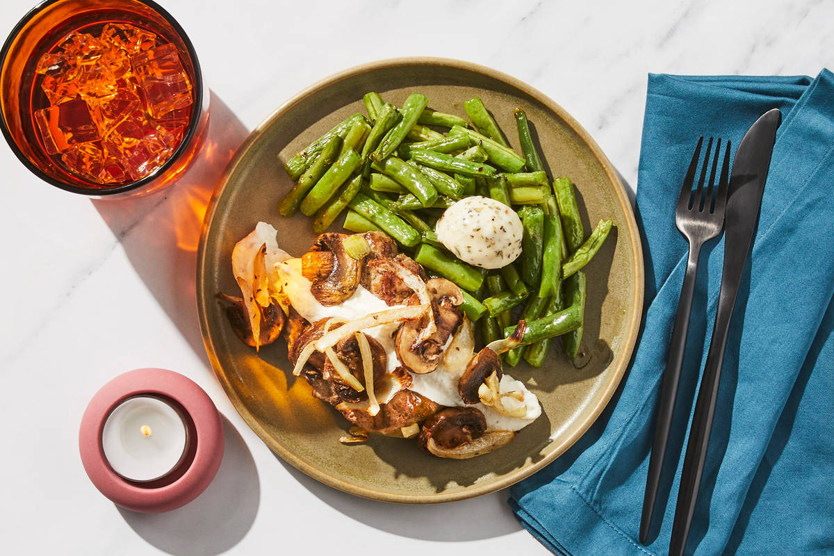 Craving a burger? This ultra-juicy beef patty is smothered with savory sauteéd mushrooms and onions, then topped with a rich and creamy goat cheese sauce to meld all the flavors together. On the side are roasted green beans topped with Parmesan-herb butter. **Ingredients:** Ground Beef, Green Beans, Mushrooms, Goat Cheese (Whole Pasteurized Goat Milk, Salt, Cheese Culture, Enzymes), Onions, Water, Whole Milk (Pasteurized Milk, Vitamin D3), Olive Pomace Oil (Refined Olive Pomace Oil, Extra Virgin Olive Oil), Unsalted Butter (Pasteurized Cream, Natural Flavorings), Garlic, Granulated Onion, Green Onions, Cream Cheese (Pasteurized Milk And Cream, Salt, Cheese Culture, Stabilizers (Xanthan Gum, Carob Bean Gum, Guar Gum)), Vinegar, Granulated Garlic, Sea Salt, Grated Parmesan Cheese (Imported Parmesan Cheese (Pasteurized Cow'S Milk, Cheese Culture, Salt, Enzymes), Water, Milk Protein, Palm Oil Blend, Disodium Phosphate, Citric Acid, Xanthan Gum, Powdered Cellulose (Anti-Caking Agent), Calcium Propionate (Preservative)), Reduced Brown Stock (Veal Stock (Veal Bones, Water), Beef Stock, Mirepoix Stock (Made Of Carrot, Celery, And Onion Stocks), Tomato Paste, Salt, Gelatin, Red Wine Concentrate (Sulfites), Onion Juice Concentrate, Carrot Juice Concentrate, Celery Juice Concentrate, Yeast Extract, Natural Flavors), Smoked Black Pepper (Pepper, Smoke Flavor), Black Pepper, Rosemary Powder, Dried Parsley, White Pepper, Thyme, Dried Chives, Rosemary, Dried Oregano The nutrition facts are based off of the recommended serving size. Serving Size = 1 Tray (292g)