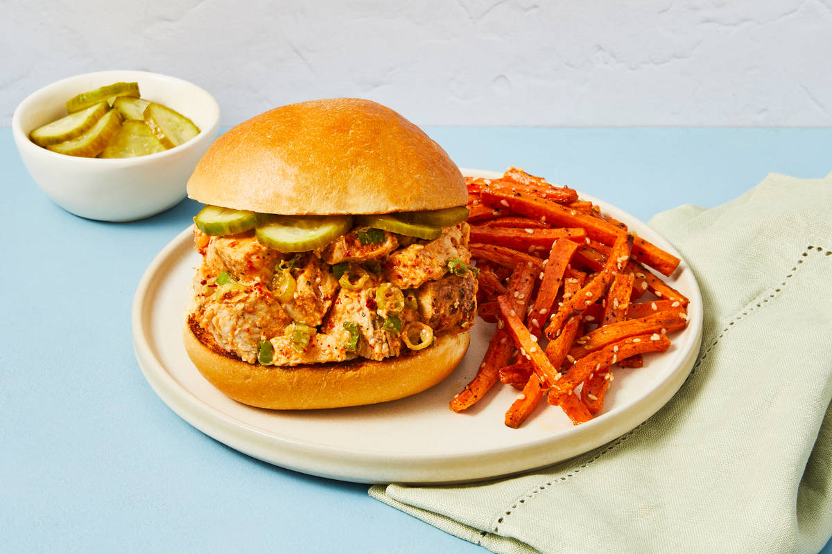 Give your classic chicken salad sandwich a twist with gochujang, a fermented Korean chili paste that’s savory, sweet, and just a little bit spicy. Tangy, quick-pickled cucumber adds extra brightness to these sandwiches, which you’ll build on top of warm toasted potato buns. Add a side of roasted sesame carrot fries and dig in!