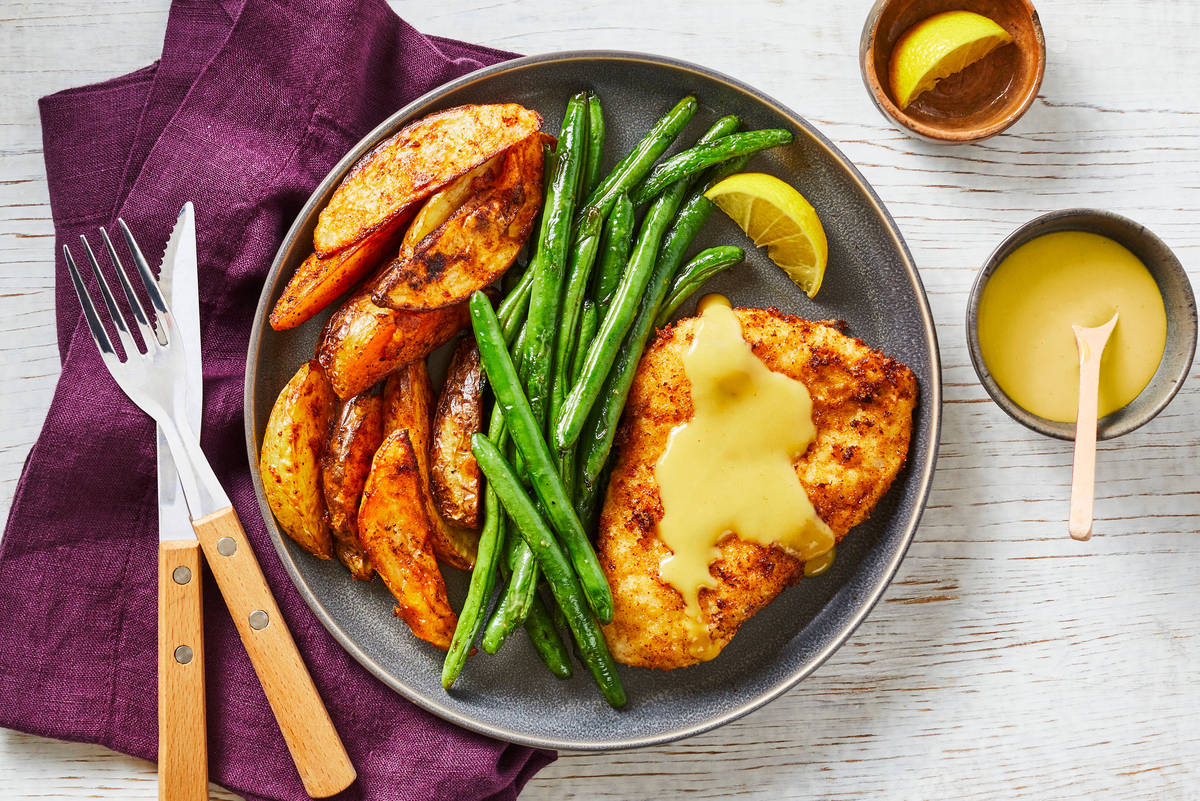 Crispy chicken is pretty much perfect in any form, but this isn’t your run-of-the-mill schnitzel. To amp up flavor, we’ve added lemon zest and garlic powder to our breadcrumb mixture, then paired the crispy cutlets with our new favorite condiment: a creamy honey Dijon dipping sauce. Speaking of, we’re serving up sides of roasted potatoes and green beans for extra dipping, but if you broke out the spoon to scrape up leftover sauce, we wouldn’t judge.