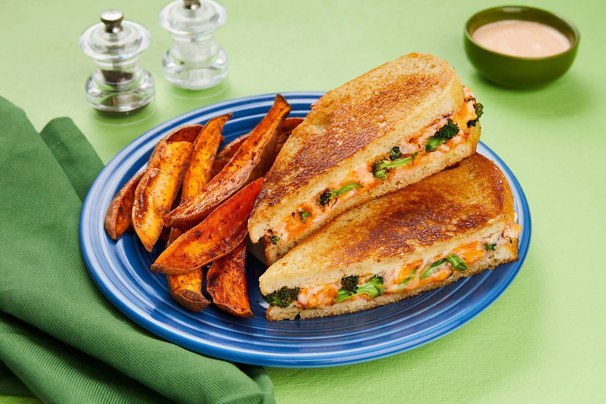 Broccoli and cheddar are a comfort food match made in heaven. Tonight, we’re taking the combo out of the soup bowl and into a sandwich: an ultra-decadent melt. Sourdough bread slices are layered with charred broccoli and a blend of cream cheese and cheddar; then, the sandwiches crisp up in a hot pan with butter until perfectly golden and melty. On the side, there’s roasted sweet potato wedges and smoky red pepper crema for dipping your spuds, your sandwich, or both—it’s up to you!