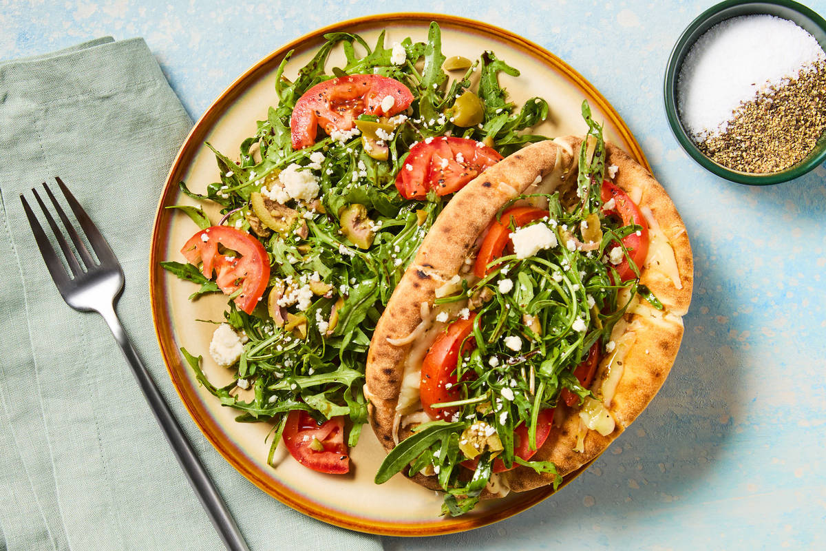 Crispy pita bread loaded with melted mozzarella takes this handheld Greek salad to the next level of deliciousness! You’ll pile on peppery arugula, juicy tomato, herbaceous dill, and briny olives and feta cheese to create these hearty vegetable-forward gyro-style wraps. Tangy balsamic glaze brightens this substantial salad that overflows onto your plate.