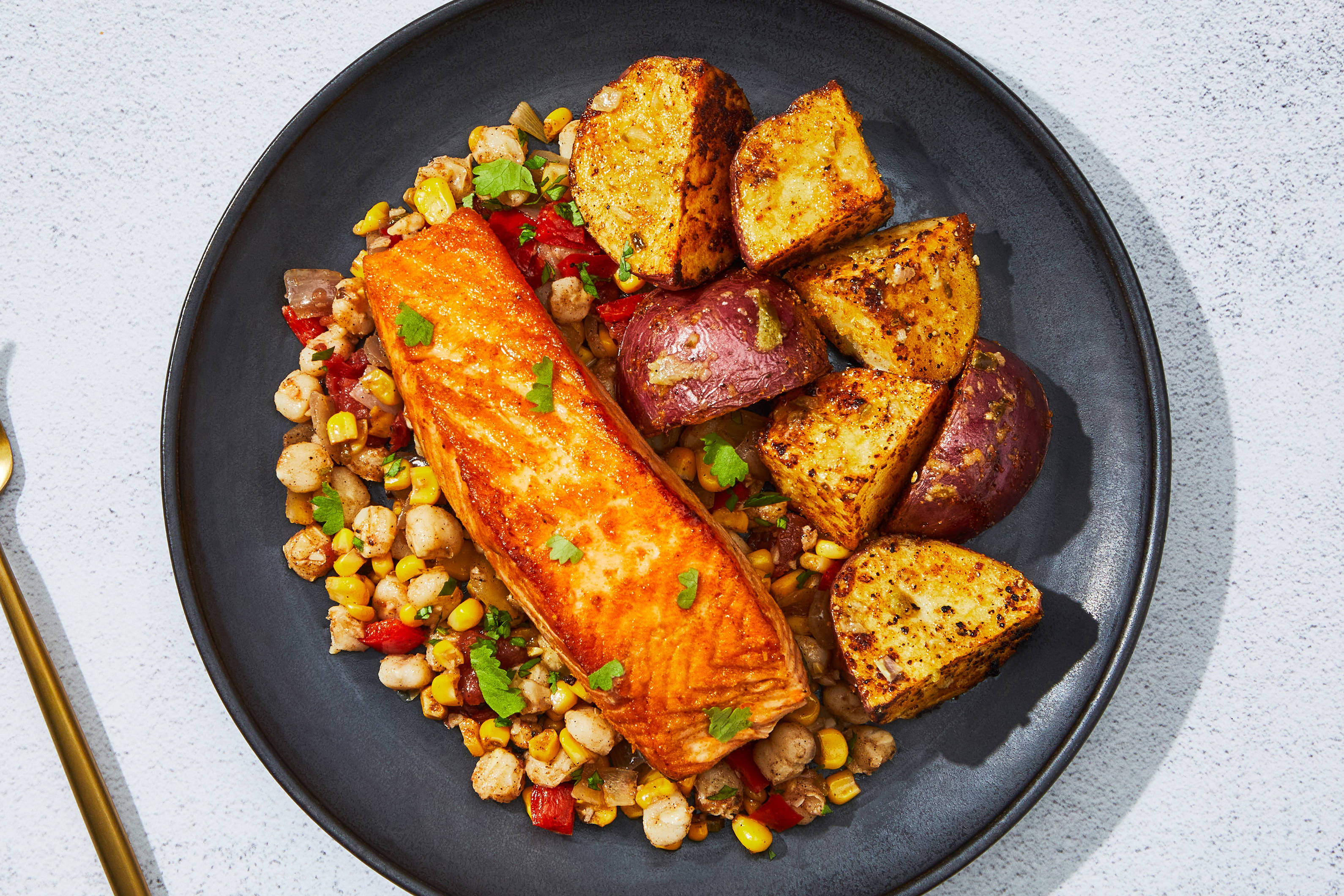 Pat chicken or salmon dry with paper towels; season with salt and pepper. Heat a drizzle of oil in a large, preferably nonstick, pan over medium-high heat. Add chicken or salmon (skin sides down). Cook chicken until browned and cooked through, 5-6 minutes per side; or cook salmon until skin is crisp, 5-6 minutes, then flip and cook until cooked through, 2-3 minutes more. Transfer to a cutting board to rest.