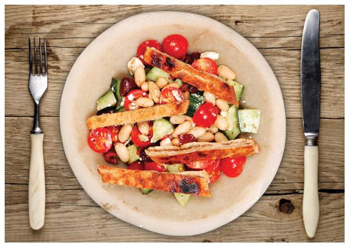 undefinedundefined protein Take a trip to Greece with this exotic dish. Creamy cannellini beans are simmered in a Mediterranean-inspired garlic marinade, then served over a bed of tomato, feta, cucumber, olives, and warm pita strips.