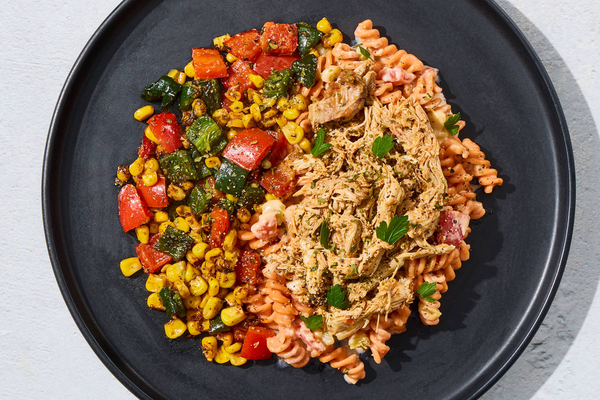Savory taco-seasoned shredded chicken thighs are mixed with a limy tomato salsa and spooned over tender red lentil fusilli. It’s all draped in a creamy and piquant tomato–green chile sauce, garnished with cilantro, and served with a side of southwest-spiced corn and poblano medley. Ingredients: Boneless Skinless Chicken Thighs, Red Lentil Fusilli (Water, Red Lentil Flour, Potato Starch, Tapioca Starch, Whole Egg, Egg White, Xanthan Gum, Salt), Yellow Sweet Corn, Roasted Corn, Diced Tomatoes (Tomatoes, Tomato Juice, Salt, Calcium Chloride, Citric Acid), Poblano Peppers, Red Bell Peppers, Cream Cheese (Pasteurized Milk And Cream, Salt, Cheese Culture, Stabilizers (Xanthan Gum, Carob Bean Gum, Guar Gum)), Heavy Cream (Heavy Cream, Milk, Gellan Gum, Sunflower Lecithin), Whole Milk (Pasteurized Milk, Vitamin D3), Onions, Water, Shredded Cheddar Cheese (Pasteurized Milk, Cheese Cultures, Salt, Enzymes, Annatto (Vegetable Color), Anti-Caking Agent (Potato Starch, Powdered Cellulose, Corn Starch), Natamycin (A Natural Mold Inhibitor)), Diced Green Chile Peppers (Green Chile Peppers, Water, Salt, Citric Acid, Calcium Chloride), Garlic, Olive Pomace Oil (Refined Olive Pomace Oil, Extra Virgin Olive Oil), Shredded Low Moisture Mozzarella Cheese (Pasteurized Milk, Cheese Cultures, Salt, Enzymes, Anti-Caking Agents (Potato Starch, Powdered Cellulose) Natamycin (A Natural Mold Inhibitor)), Vinegar, Lime Juice (Water, Lime Juice From Concentrate), Sea Salt, Jalapeño Peppers, Cumin, Cilantro, Paprika (Paprika And Silicon Dioxide (Added To Make Free Flowing)), Black Pepper, Chili Powder (Chili Pepper, Spices (Including Mustard), Salt, Garlic Powder), Ancho Chile Powder, Granulated Garlic, Toasted Onion Powder, Toasted Garlic Powder, Granulated Onion, Dried Oregano, Coriander, Smoked Paprika The nutrition facts are based off of the recommended serving size. Serving Size = 1 Tray (357g)