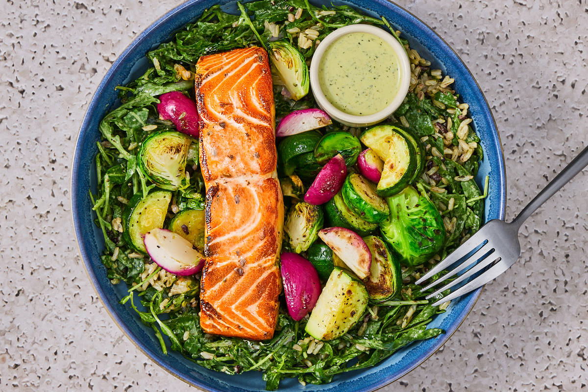 We love green goddess dressing for its creamy texture and vibrant, zippy flavor that seems to elevate anything it touches. Here, we’re using the tangy, herb-packed dressing to top off wholesome bowls that are packed with a blend of grains, fresh arugula, and a ton of roasted veggies (think: radishes, Brussels sprouts, *and* zucchini!).