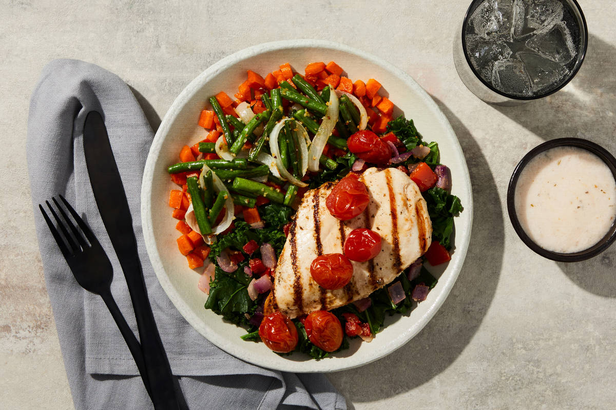 Enjoy this flavorful meal packed with veggies and Mediterranean flavors. It starts with a medley of steamed kale, sautéed red bell peppers, and red onions. It’s topped with an herbed chicken breast that’s grilled to perfection. Roasted green beans and carrots are served on the side, plus a bright and creamy lemon-herb dressing to drizzle as you please. **Ingredients:** Boneless Chicken Breast With Rib Meat, Green Beans, Carrots, Kale, Grape Tomatoes, Red Bell Peppers, Red Onions, Olive Pomace Oil (Refined Olive Pomace Oil, Extra Virgin Olive Oil), Water, Onions, Great Northern Beans (Prepared Great Northern Beans, Water, Salt, Calcium Chloride (Firming Agent)), Lemon Juice, Vinegar, Red Wine Vinegar (Diluted With Water To 5% Acidity), Garlic, Sea Salt, Toasted Garlic Powder, Granulated Onion, Toasted Garlic, Black Pepper, Granulated Garlic, Dried Oregano, Dried Thyme, Dried Dill, Dried Rosemary, Lemon Powder (Citric Acid, Natural Lemon Flavor), Baking Soda, Xanthan Gum The nutrition facts are based off of the recommended serving size. Serving Size = 1 Tray (357g)