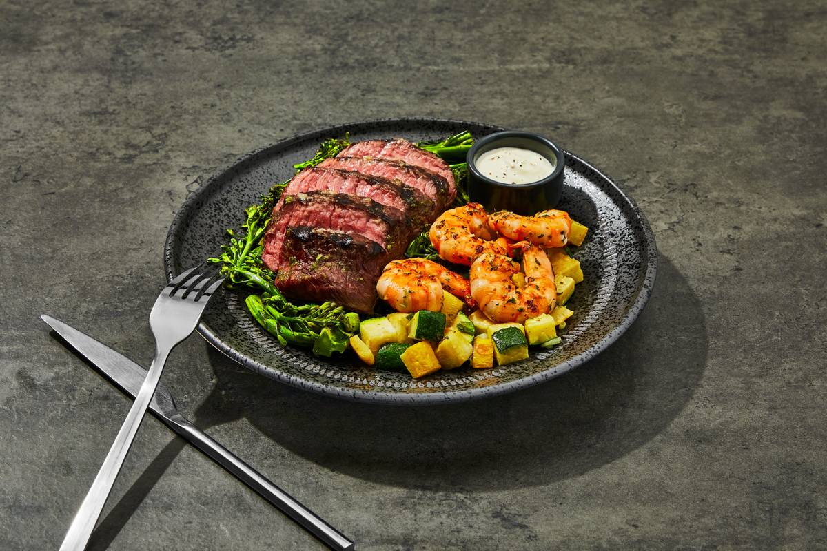 We’ve pumped up the protein with a luxurious pairing of shrimp and steak, each with its own side of veggies. The juicy grilled filet mignon is served over roasted broccolini, and topped with smoky onion butter. Herby lemon garlic shrimp are served over summer squash roasted with scallion oil, and topped with a rich Parmesan cream sauce.