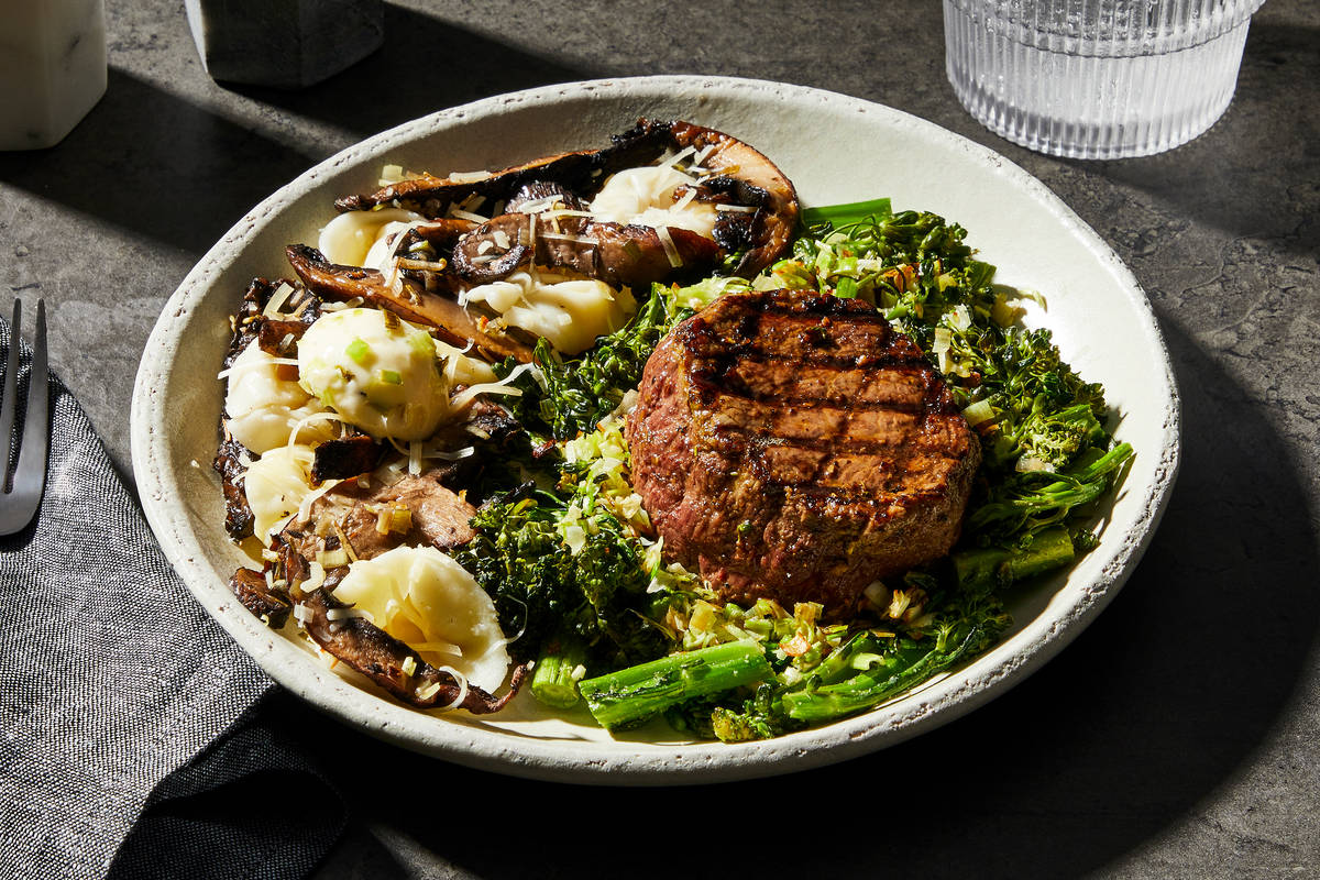 If you’re looking for luxury, this meal’s for you! A juicy marinated grilled beef filet is set atop a bed of savory roasted broccolini and leeks. For an equally elevated side dish, the steak is served with tortellini tossed in a velvety sauce made with portobello mushrooms, Parmesan, and earthy, fragrant truffle oil. **Ingredients:** Beef Tenderloin, Broccolini, Mushrooms, Four Cheese Brown Rice Tortellini (Tortellini Dough (Water, Brown Rice Flour, Potato Starch, Tapioca Starch, Whole Egg, Egg White, Flax Seed, Xanthan Gum, Salt, Glucono Delta-Lactone), Tortelloni Filling (Mozzarella Cheese (Pasteurized Milk, Cheese Culture, Salt, Enzyme), Asiago Cheese (Cultured Milk, Salt, Enzyme), Parmesan Cheese (Cultured Milk, Salt, Enzyme), Ricotta Cheese (Pasteurized Whey, Cream, Milk, Vinegar, Salt), Potato Flakes, Olive Oil, Salt)), Leeks, Unsalted Butter (Pasteurized Cream, Natural Flavorings), Olive Pomace Oil (Refined Olive Pomace Oil, Extra Virgin Olive Oil), Shredded Parmesan Cheese (Pasteurized Part-Skim Milk, Cheese Culture, Salt, Enzymes, Powdered Cellulose (Added To Prevent Caking), Natamycin (A Natural Mold Inhibitor And To Protect Flavor)), Water, Garlic, Vinegar, Reduced Brown Stock (Veal Stock (Veal Bones, Water), Beef Stock, Mirepoix Stock (Made Of Carrot, Celery, And Onion Stocks), Tomato Paste, Salt, Gelatin, Red Wine Concentrate (Sulfites), Onion Juice Concentrate, Carrot Juice Concentrate, Celery Juice Concentrate, Yeast Extract, Natural Flavors), Sea Salt, Toasted Onion Powder, White Truffle Oil (Pure Olive Oil, Artificial And Natural Flavor), Black Pepper, Toasted Garlic Powder, Green Onions, Rosemary, Thyme, Dried Parsley, Dried Chives, Smoked Black Pepper (Pepper, Smoke Flavor), Lemon Juice The nutrition facts are based off of the recommended serving size. Serving Size = 1 Tray (377g)