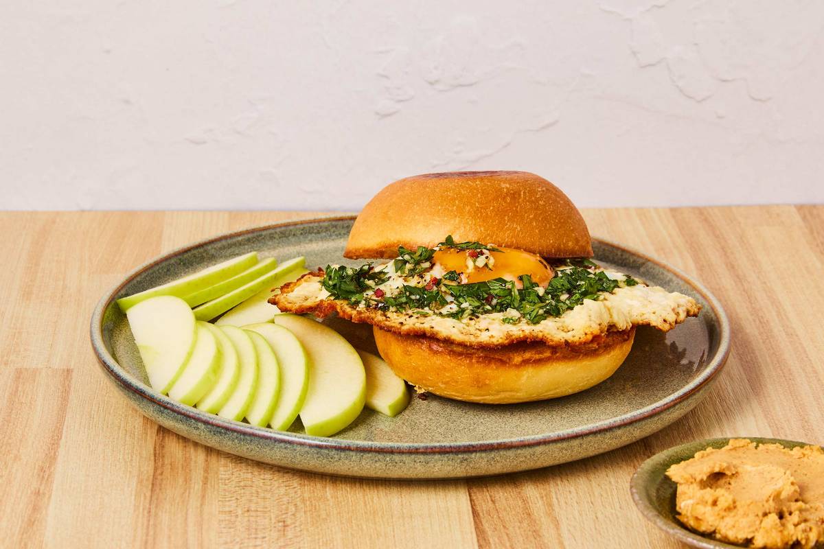Fill toasted buns with feta eggs and herb sauce; divide between plates. Serve with apple slices and creamy peanut butter for dipping.