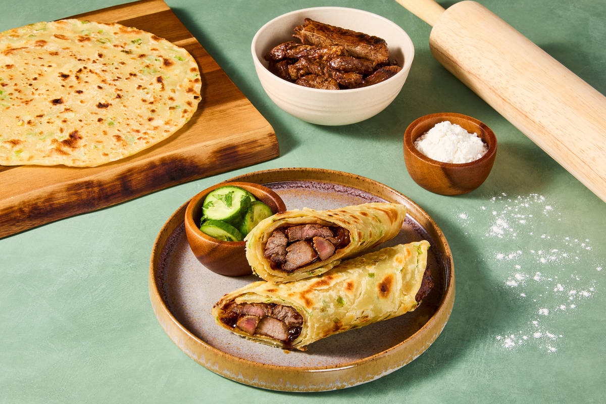 Homemade scallion pancakes envelop hoisin-marinated steak strips in this Chinese restaurant-inspired recipe that’s perfect for a weekend project! You’ll roll the dough out several times to ensure flaky layers, then pan-fry until speckled with tasty charred spots. Serve your roll-ups with a refreshing cucumber salad for a delicious, unique meal.