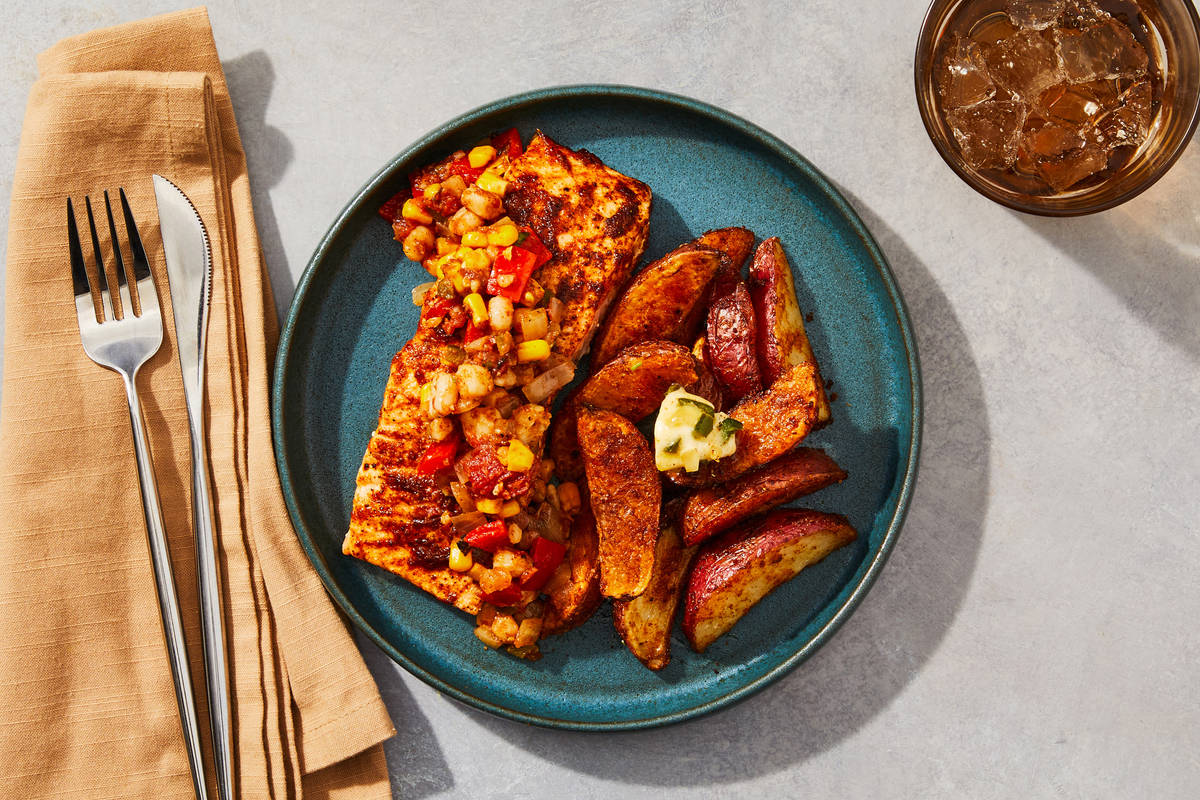 Southwest flavors are front and center with a baked salmon fillet infused with our Baja-style marinade. A chunky salsa packed with hominy, corn, fire-roasted tomatoes, jalapeños, and red peppers is spooned over the top. On the side, paprika-roasted potato wedges are crowned with a rich fajita butter dotted with poblanos, onions, and cumin. **Ingredients:** Red Potatoes (Red Potatoes, Sodium Metabisulfite (Added To Maintain Color)), Atlantic Salmon (Salmon, Color Added Via Feed (Astaxanthin)), Hominy (White Hominy, Water, Salt, Sodium Metabisulfite (For Color Retention)), Fire Roasted Tomatoes (Tomatoes, Tomato Juice, Sea Salt, Calcium Chloride, Citric Acid), Yellow Sweet Corn, Red Bell Peppers, Olive Pomace Oil (Refined Olive Pomace Oil, Extra Virgin Olive Oil), Red Onions, Garlic, Cilantro, Onions, Unsalted Butter (Pasteurized Cream, Natural Flavorings), Jalapeño Peppers, Water, Vinegar, Lime Juice (Water, Lime Juice From Concentrate), Smoked Paprika, Sea Salt, Granulated Garlic, Granulated Onion, Ancho Chile Powder, Black Pepper, Poblano Peppers, Chili Powder (Chili Pepper, Spices (Including Mustard), Salt, Garlic Powder), Cumin, Coriander, Orange Juice The nutrition facts are based off of the recommended serving size. Serving Size = 1 Tray (357g)