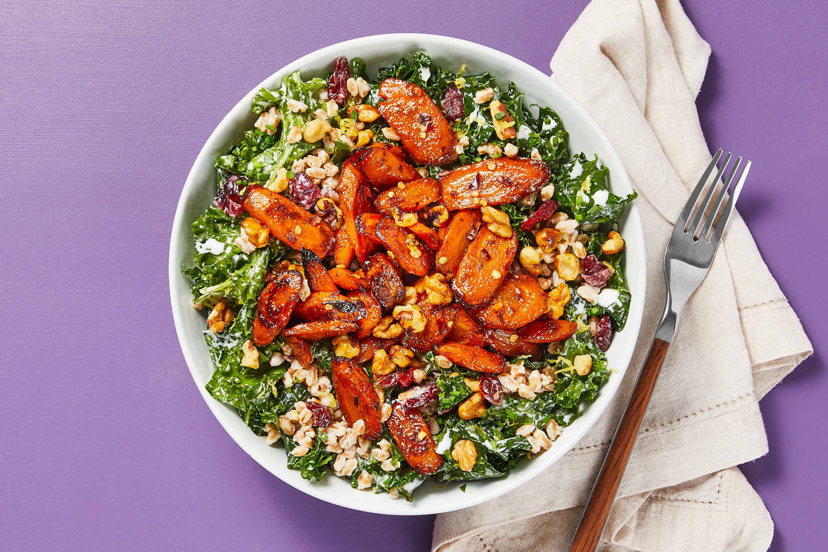 Farro, a variety of hulled wheat, is praised for its chewy texture and nutty flavor. To make this salad really shine, we paired the tasty ancient grain with spicy glazed honey roasted carrots and walnuts, sweet-tart marinated cranberries, lemony dressing, fresh kale, and a creamy herb dressing. This dinner is so good, it’s almost not farro to the other grain bowls in the world.
