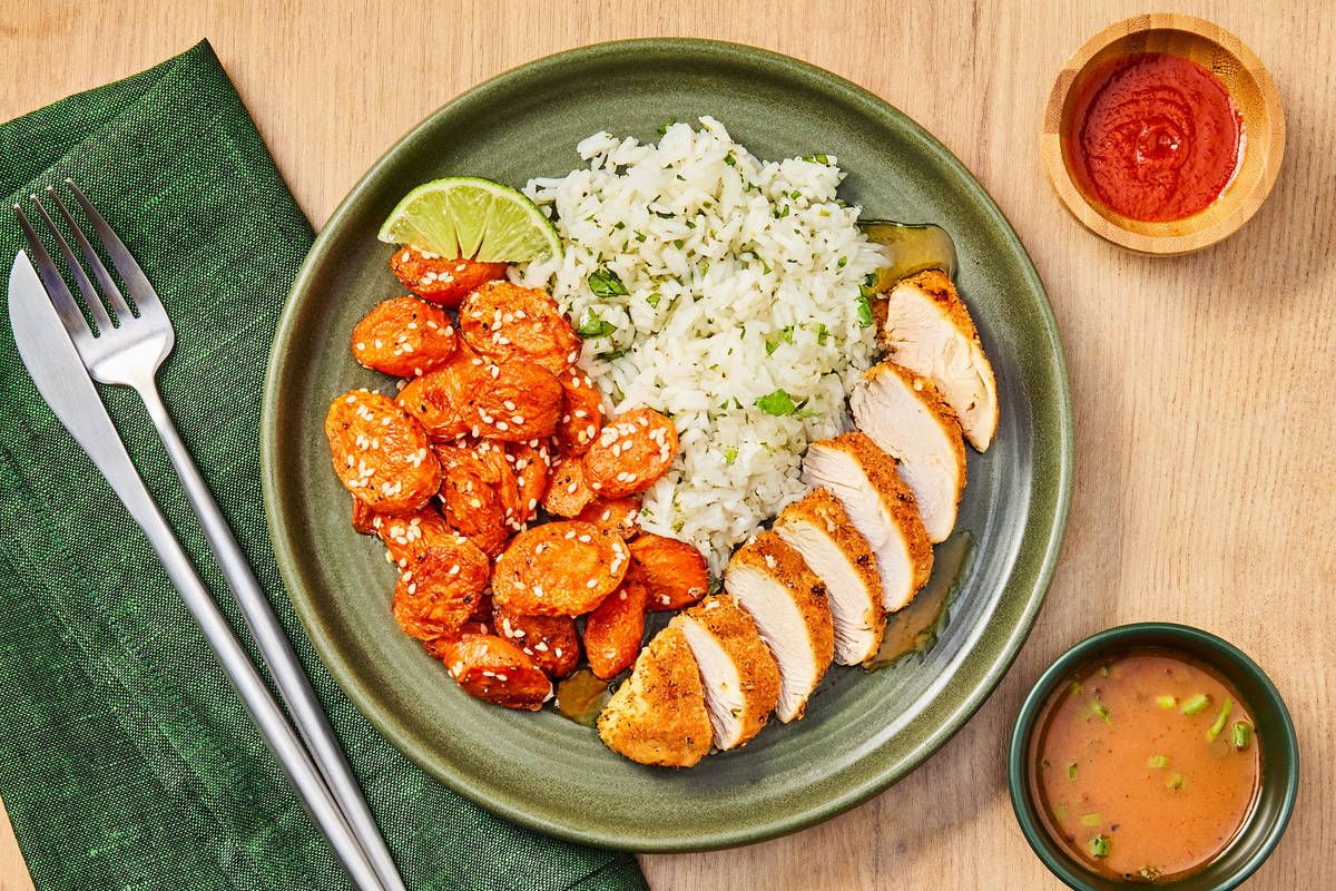 Another work day, another dinner daydream. You know what we mean. You’re sitting at your desk and 2:00 p.m. rolls around. Suddenly, all you can think is, “Dinner...what the heck am I going to eat for dinner?!” Well, we’ve got you covered, and FYI, the answer to that question is pretty glorious. We’re talking succulent pork filet, roasted sesame carrots, and fluffy cilantro lime rice. To finish things off, the pork is drizzled in a lick-the-plate-worthy sauce made with sesame oil, scallions, ginger, honey, and sriracha. Talk about a dream come true!