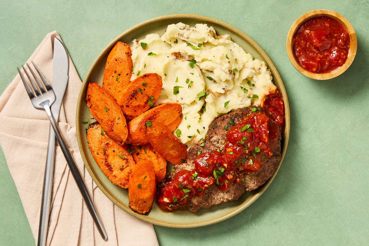 Update your classic blue plate special with tender mini beef meatloaves topped with a quick homemade herbed marinara sauce. On the side is a generous scoop of silky mashed potatoes swirled with sour cream and butter, plus a wholesome helping of earthy-sweet roasted carrots with a sprinkle of herbaceous parsley to tie it all together.