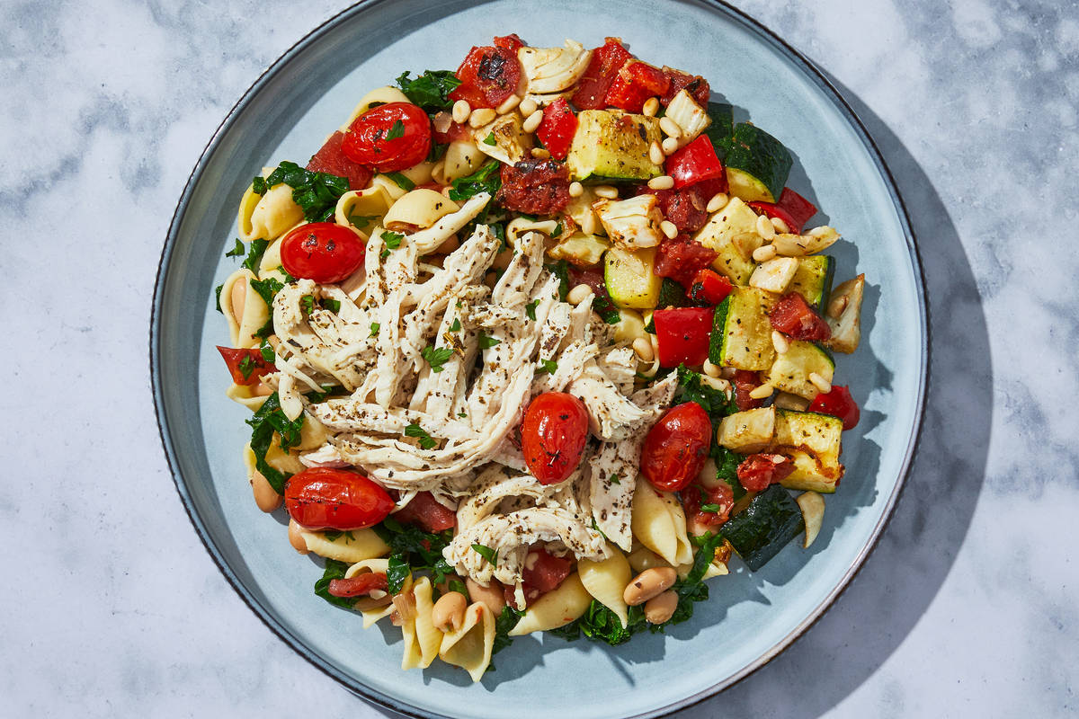 Ingredients: Boneless Chicken Breast with Rib Meat, Zucchini, Great Northern Beans (Prepared Great Northern Beans, Water, Salt, Calcium Chloride (Firming Agent)), Cauliflower Shells (Water, Cauliflower Powder, Potato Starch, Tapioca Starch, Whole Egg, Egg White, Xanthan Gum, Konjac, Salt), Grape Tomatoes, Chardonnay Wine (Grapes, Sulfites), Red Bell Peppers, Water, Kale, Fire Roasted Tomatoes (Tomatoes, Tomato Juice, Sea Salt, Calcium Chloride, Citric Acid), Fennel, Olive Pomace Oil (Refined Olive Pomace Oil, Extra Virgin Olive Oil), Fire Roasted Tomatoes (Tomatoes, Tomato Juice, Sea Salt, Calcium Chloride, Citric Acid), Onions, Pine Nuts, Garlic, Brown Chicken Stock (Chicken Stock, Mirepoix Stock (Made of Carrot, Celery, And Onion Stocks), Salt, Bovine Gelatin, White Wine, Carrot Juice Concentrate, Yeast Extract, Celery Juice Concentrate, Onion Powder, White Wine (Sulfites), Natural Flavors), Fennel, Red Wine Vinegar (Diluted with Water to 5% Acidity), Lemon Juice, Sea Salt, Tomato Powder (Tomato Powder, Silicon Dioxide (anti-caking agent)), Tapioca Starch, Toasted Garlic Powder, Dried Parsley, Toasted Onion Powder, Granulated Garlic, Parsley, Green Onions, Gochugaru Chile Flakes, Ground Fennel, Black Pepper, Smoked Paprika, Dried Thyme, Tomato Paste (Tomatoes, Citric Acid), crushed Red Pepper flakes, Dried Oregano, Cumin, Dried Onion Flakes, Toasted Garlic, Xanthan Gum The nutrition facts are based off of the recommended serving size. Serving Size = 1 Tray (363g)