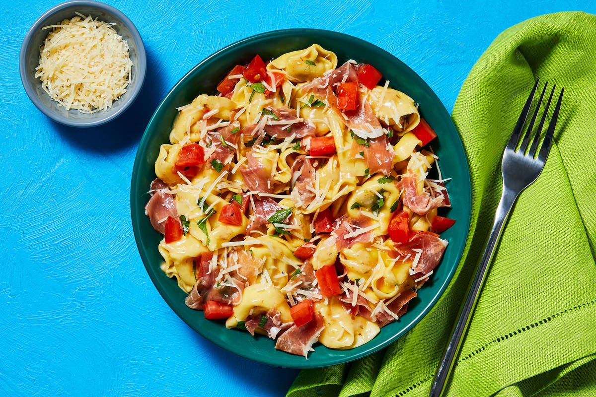 • Divide tortelloni salad between bowls. Top with remaining prosciutto and remaining Parmesan and serve.