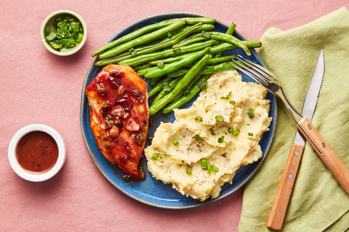 Chicken is always a weeknight winner. It’s satisfying, speedy, and so versatile—which is why our chefs are always brainstorming new ways to take it to the next level. This week, they went all out by searing cutlets to juicy perfection, then drizzling ‘em with a glossy cherry jam and fresh thyme pan sauce. On the side, there’s roasted green beans plus sour cream and scallion mashed potatoes (perfect for catching any runaway sauce). You’d be chicken not to try it.
