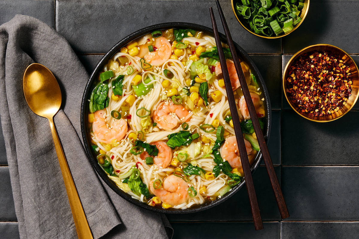 These loaded Japanese-inspired shrimp ramen bowls are as impressive as they are satisfying, packed with tender noodles, sweet corn, a hearty mix of cabbage and bok choy, and—of course—plenty of shrimp. Sprinkle each bowl with scallions, sesame seeds, and chili flakes, then dig right in!