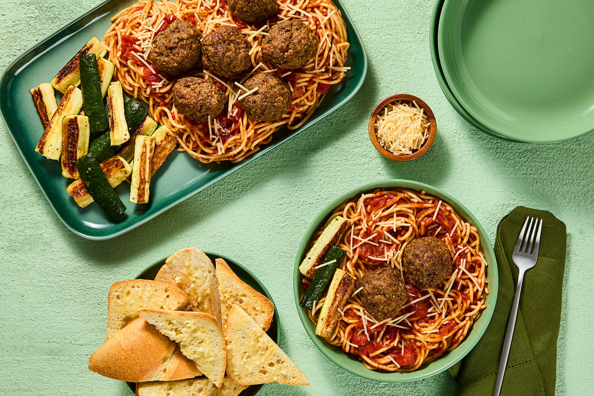 OF COURSE your nonna’s spaghetti and meatballs is the best! But does hers come right to your door, ready to roll and big enough to serve a crowd? You’ll roast up juicy beef meatballs beside seasoned zucchini. Toss spaghetti with tangy marinara, add those meatballs, sprinkle with lots of Parmesan, and serve it all with crusty garlic ciabatta. This recipe is double the typical servings, providing 4 servings and 8 servings for a 2 person and 4 person box respectively.
