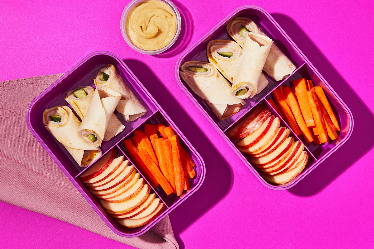 • To serve: Serve turkey roll-ups with carrot sticks, apple slices, and hummus on the side. • To stash: Refrigerate turkey roll-ups, carrot sticks, apple slices, and hummus in separate containers and pack as desired.