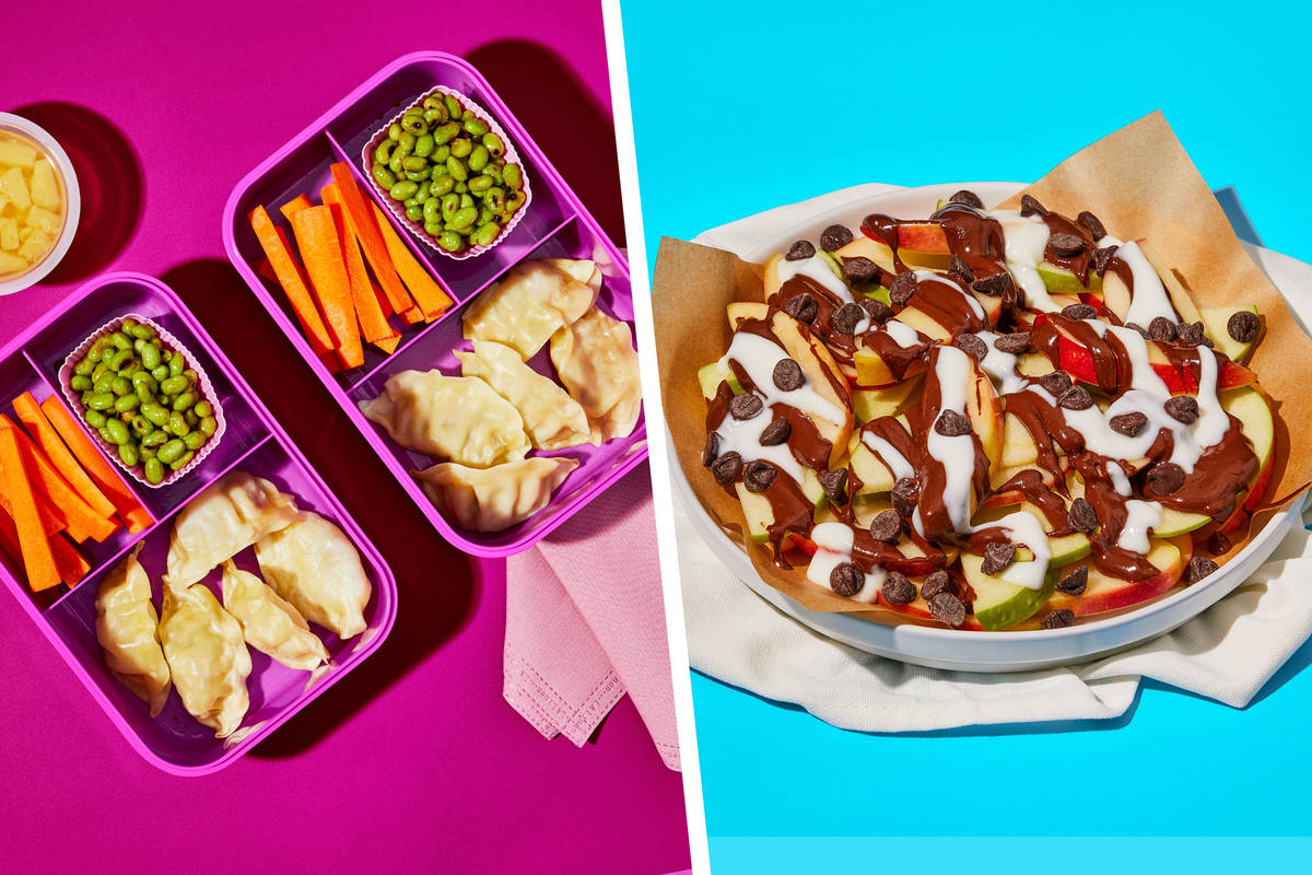 Does planning, cooking, and packing kids’ lunches + snacks feel like a part-time job? Well, this 15-minute lunch (+ 20-minute snack) is the perfect make-ahead time-saver: a kid-approved dumpling platter with dipping sauce and charred edamame, complete with carrot sticks and juicy pineapple! But wait—it’ll be snacktime before you know it! Whip up a plate of apple “nachos” drizzled with a yogurt and peanut butter-chocolate sauce duo, all sprinkled with chocolate chips. Yup, we’re thinking outside the lunchbox (so you don’t have to!). This recipe is designed to provide lunch and snack components for multiple days. For each lunch and snack meal, 3 servings and 6 servings are provided for a 2 person and 4 person box respectively. Nutrition information under the Nutrition Values section below is for the lunch portion. The following nutrition information is for 1 serving of the snack meal: Calories: 310, Fat: 17g, Saturated Fat: 7g, Cholesterol: 15mg, Sodium: 45mg, Carbohydrates: 39g, Fiber: 5g, Sugar: 28g, Protein: 5g. Download the nutrition labels to see final nutrition information for both lunch and snack components.
