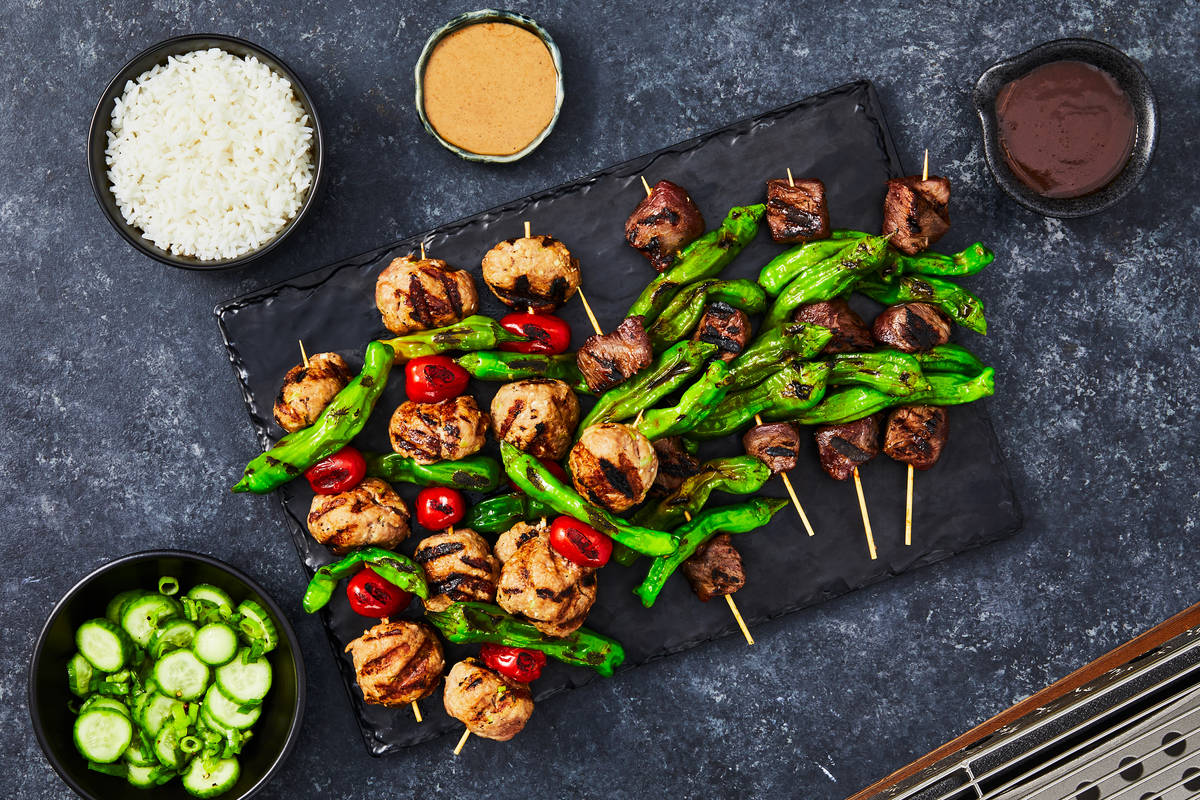 Kushiyaki—a Japanese dish of skewered and grilled meat and vegetables—is kind of the ultimate party food, and here, you'll be making two kinds. For one, you'll pair marinated steak with shishito peppers. For the other, you'll layer savory pork meatballs with tomatoes, and more shishitos. Cucumber salad, rice, and a double shot of dippers (stir-fry sauce and katsu mayo) complete the meal!