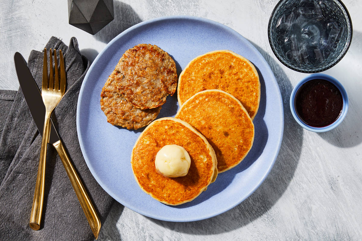 Get ready for incredibly light and fluffy pancakes! We make ours with a blend of gluten-free flours, buttermilk, eggs, vanilla, and lemon zest, plus a drop of pure lemon oil to give a delicious citrus boost. The pancakes are served with a flavorful scoop of honey lemon butter, and blueberry compote for drizzling over. On the side are two juicy chicken sausage patties. **Ingredients:** Chicken Sausage (Chicken, Contains 2% Or Less Of: Spices, Sea Salt, Parsley, Chili Pepper Flakes, Extract Of Rosemary, Vinegar), Blueberries, Gluten Free Flour Blend (Sweet White Rice Flour, Whole Grain Brown Rice Flour, Potato Starch, Whole Grain Sweet White Sorghum Flour, Tapioca Flour, Xanthan Gum), Whole Milk (Pasteurized Milk, Vitamin D3), Lowfat Buttermilk (Cultured Lowfat Milk, Nonfat Milk, Sodium Citrate, Vitamin A Palmitate, Salt, Natural Flavor, Vitamin D3), Unsalted Butter (Pasteurized Cream, Natural Flavorings), Liquid Whole Eggs (Whole Eggs, Citric Acid, 0.15% Water Added As Carrier For Citric Acid. Citric Acid To Preserve Color), Coconut Sugar, Blanched Almond Flour, Olive Pomace Oil (Refined Olive Pomace Oil, Extra Virgin Olive Oil), Honey, Vanilla Extract (Vanilla Bean Extractives In Water And Alcohol), Baking Powder (Sodium Acid Pyrophosphate, Sodium Bicarbonate, Corn Starch, Sodium Aluminum Sulfate, Monocalcium Phosphate, Silicon Dioxide), Lemon Zest, Blue Agave Nectar, Lemon Powder (Citric Acid, Natural Lemon Flavor), Pure Lemon Oil, Sea Salt, Baking Soda The nutrition facts are based off of the recommended serving size. Serving Size = 1 Tray (289g)