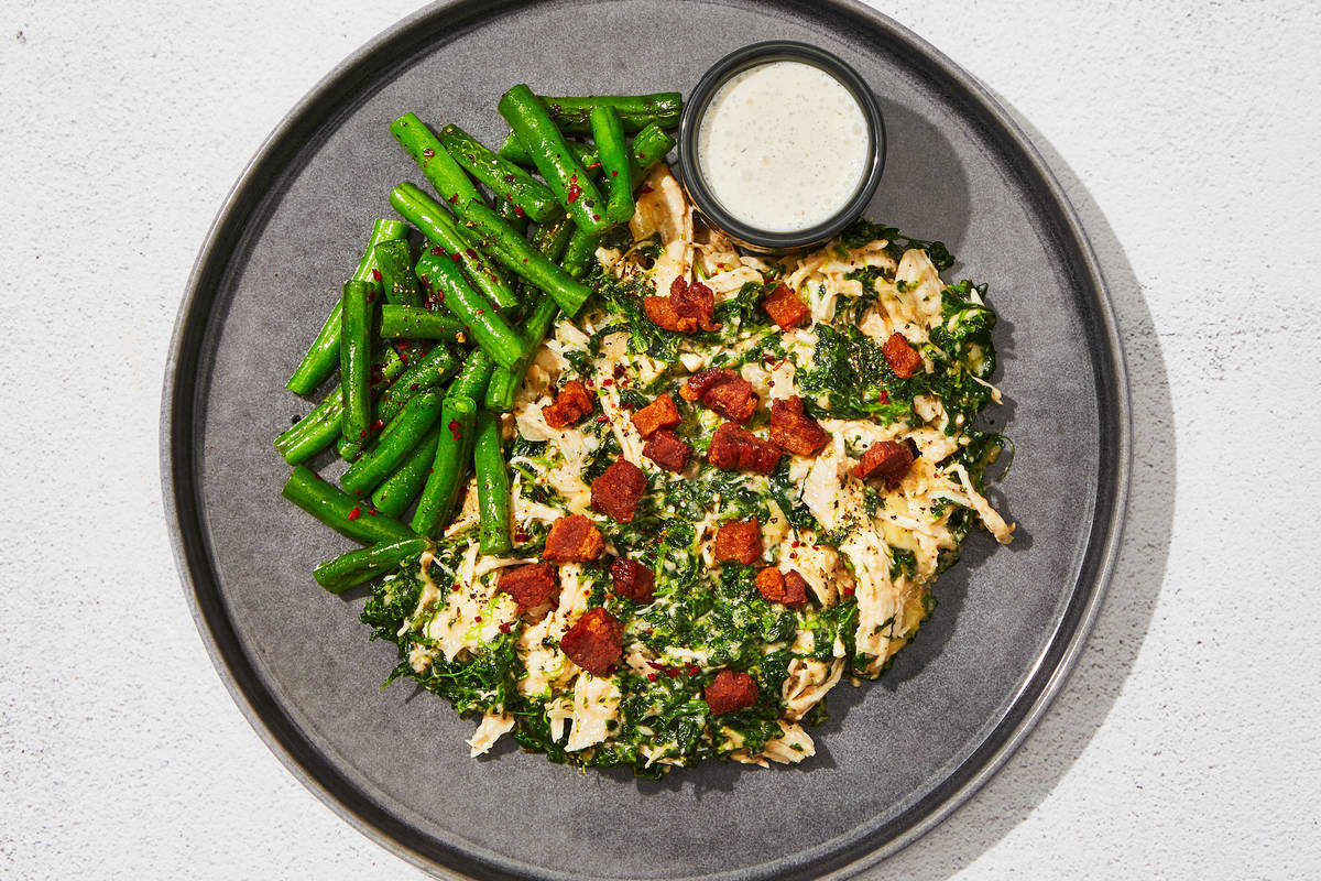 Chicken and bacon make for a delicious combo–add a rich cheese sauce and you’ve got some major comfort food on your hands! Shredded chicken, spinach, and bacon are combined with three cheeses for the main dish, with a side of ranch sour cream for more deliciousness. Roasted green beans on the side round out this hearty dinner. **Ingredients:** Boneless Chicken Breast With Rib Meat, Green Beans, Sour Cream (Cultured Cream), Water, Spinach, Shredded Smoked Gouda Cheese (Pasteurized Milk, Water, Cheese Cultures, Skim Milk, Salt, Enzymes, Sodium Phosphate, Calcium Propionate (Preservative), Apocarotenal (For Color), Powdered Cellulose (To Prevent Caking), Natamycin (A Natural Mold Inhibitor)), Nitrite/Nitrate-Free Uncured Bacon (Pork, Water, Salt, Celery Powder, Cherry Baste Aid), Olive Pomace Oil (Refined Olive Pomace Oil, Extra Virgin Olive Oil), Shredded Sharp Cheddar Cheese (Pasteurized Milk, Cheese Cultures, Salt, Enzymes, Annatto (Vegetable Color), Anti-Caking Agents (Potato Starch, Powdered Cellulose), Natamycin (A Natural Mold Inhibitor)), Cream Cheese (Pasteurized Milk And Cream, Salt, Cheese Culture, Stabilizers (Xanthan Gum, Carob Bean Gum, Guar Gum)), Onions, Buttermilk Powder, Lemon Juice, Vinegar, Garlic, Granulated Garlic, Sea Salt, Granulated Onion, Black Pepper, Brown Chicken Stock (Chicken Stock, Mirepoix Stock (Made Of Carrot, Celery And Onion Stocks), Salt, Gelatin, White Wine), Dried Dill, Dried Chives, Dried Parsley The nutrition facts are based off of the recommended serving size. Serving Size = 1 Tray (298g)